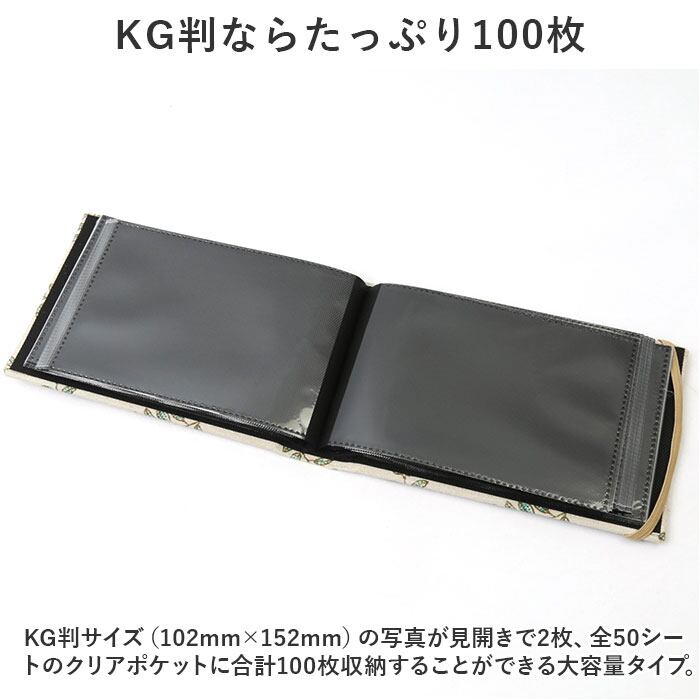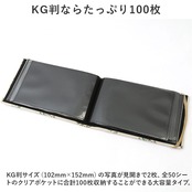 ・KG判サイズ(102mm×152mm)の写真が見開きで2枚、全50シートのクリアポケットに合計100枚収納することができる大容量タイプ。