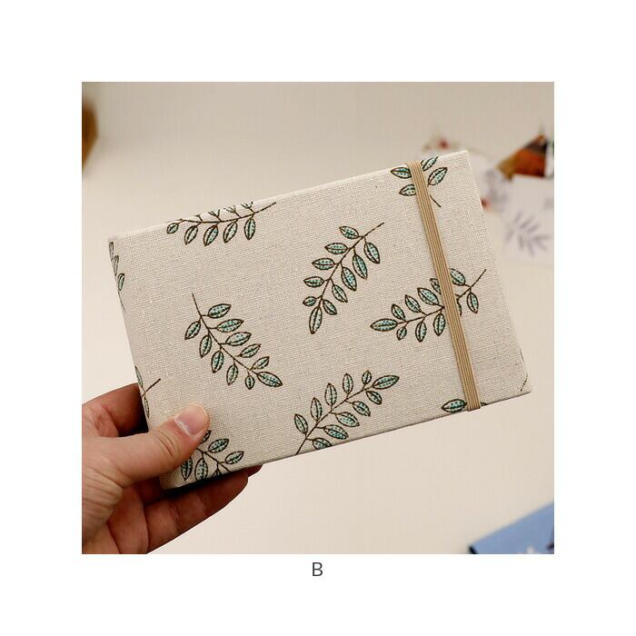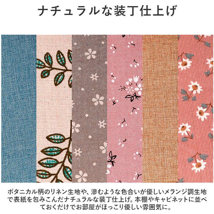 ・ボタニカル柄のリネン生地や、滲むような色合いが優しいメランジ調生地で表紙を包みこんだナチュラルな装丁仕上げ。本棚やキャビネットに並べておくだけでお部屋がほっこり優しい雰囲気に。