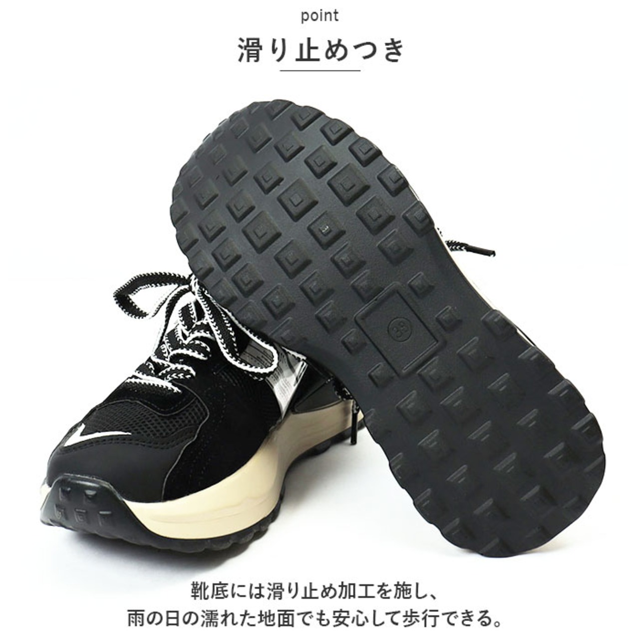 ・靴底には滑り止め加工を施し、雨の日の濡れた地面でも安心して歩行できる。