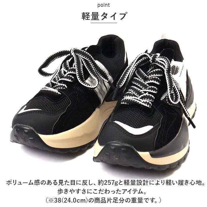 ・ボリューム感のある見た目に反し、約257gと軽量設計により軽い履き心地。歩きやすさにこだわったアイテム。(※38(24.0cm)の商品片足分の重量です。)