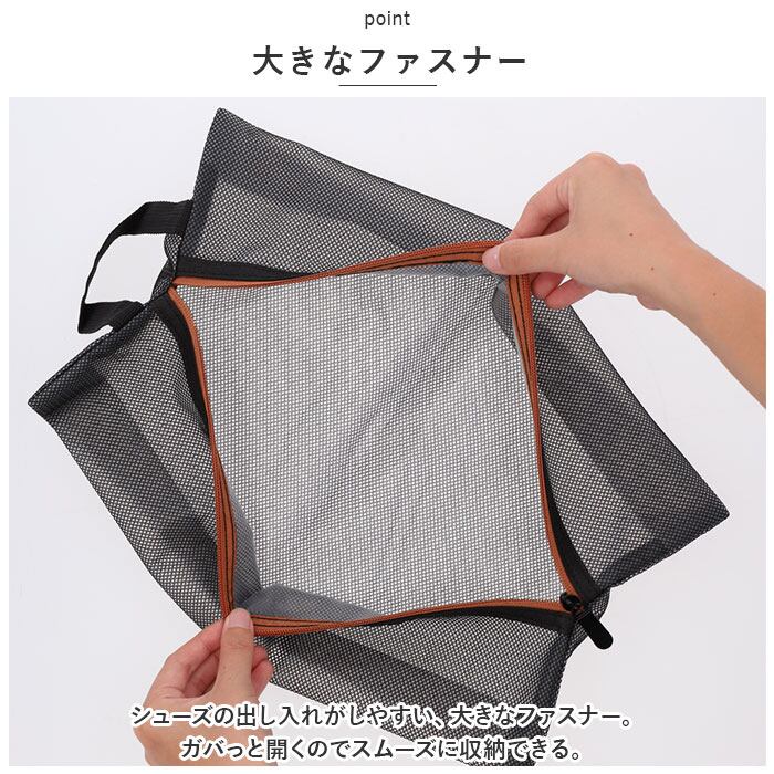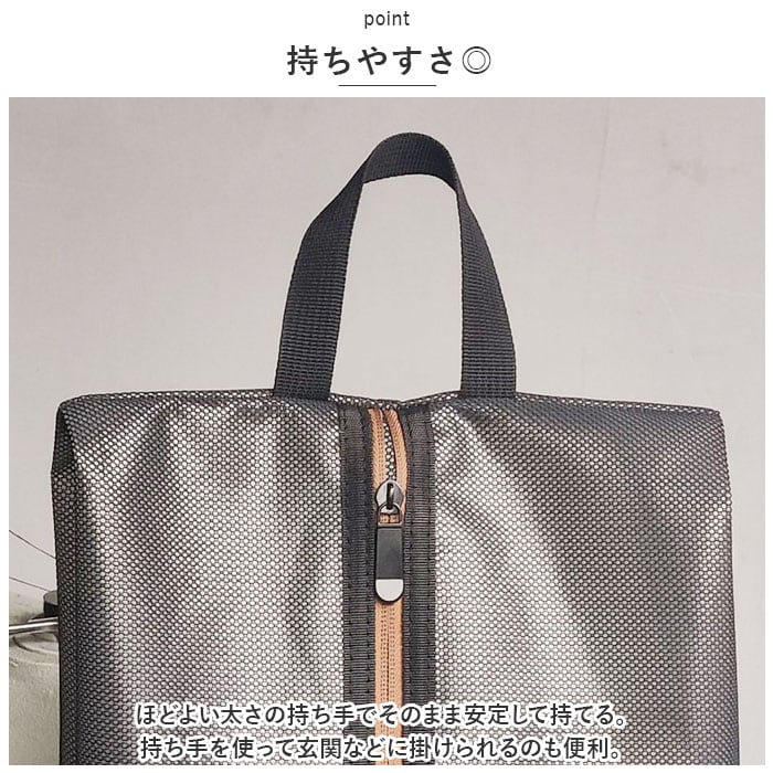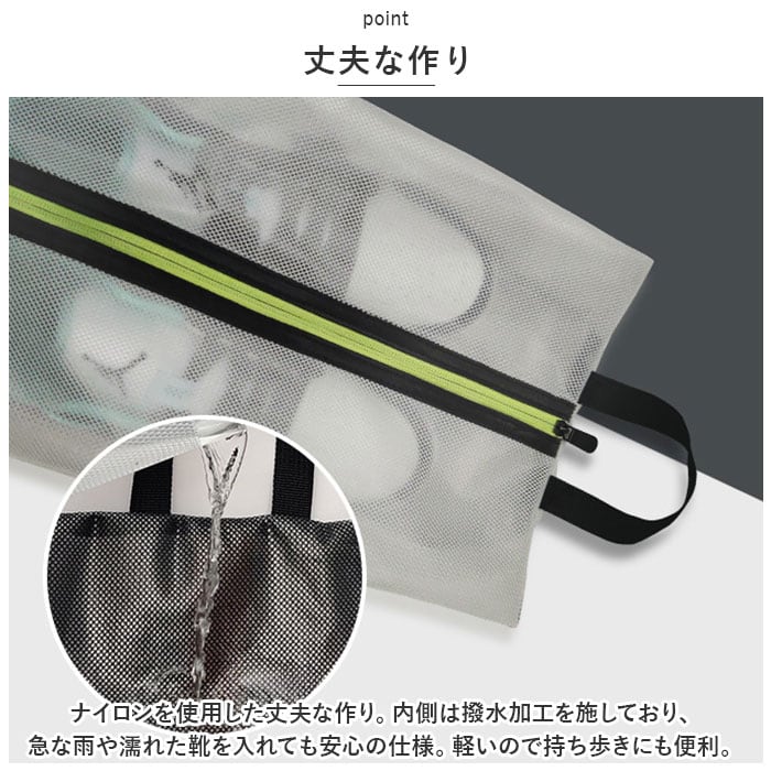 ・ナイロンを使用した丈夫な作り。内側は撥水加工を施しており、急な雨や濡れた靴を入れても安心の仕様。軽いので持ち歩きにも便利。