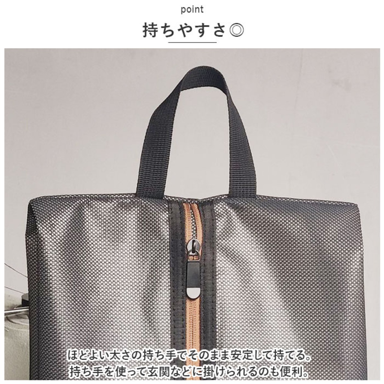 ・ほどよい太さの持ち手でそのまま安定して持てる。持ち手を使って玄関などに掛けられるのも便利。