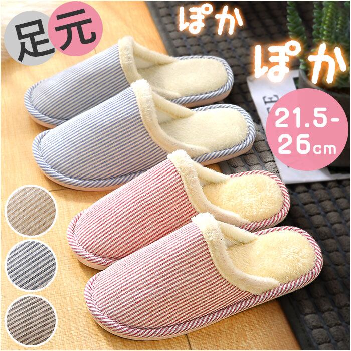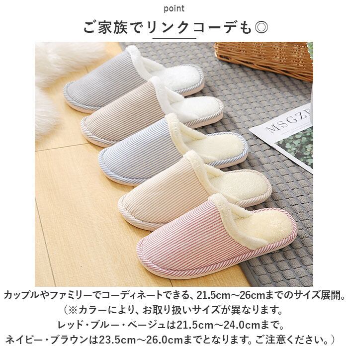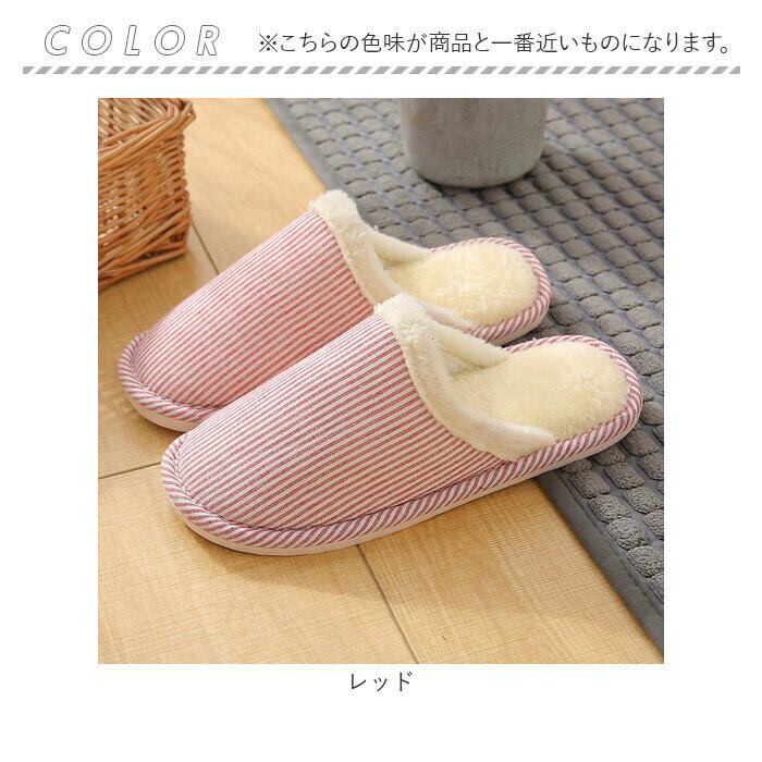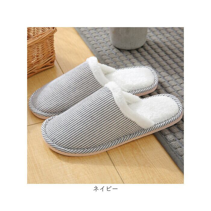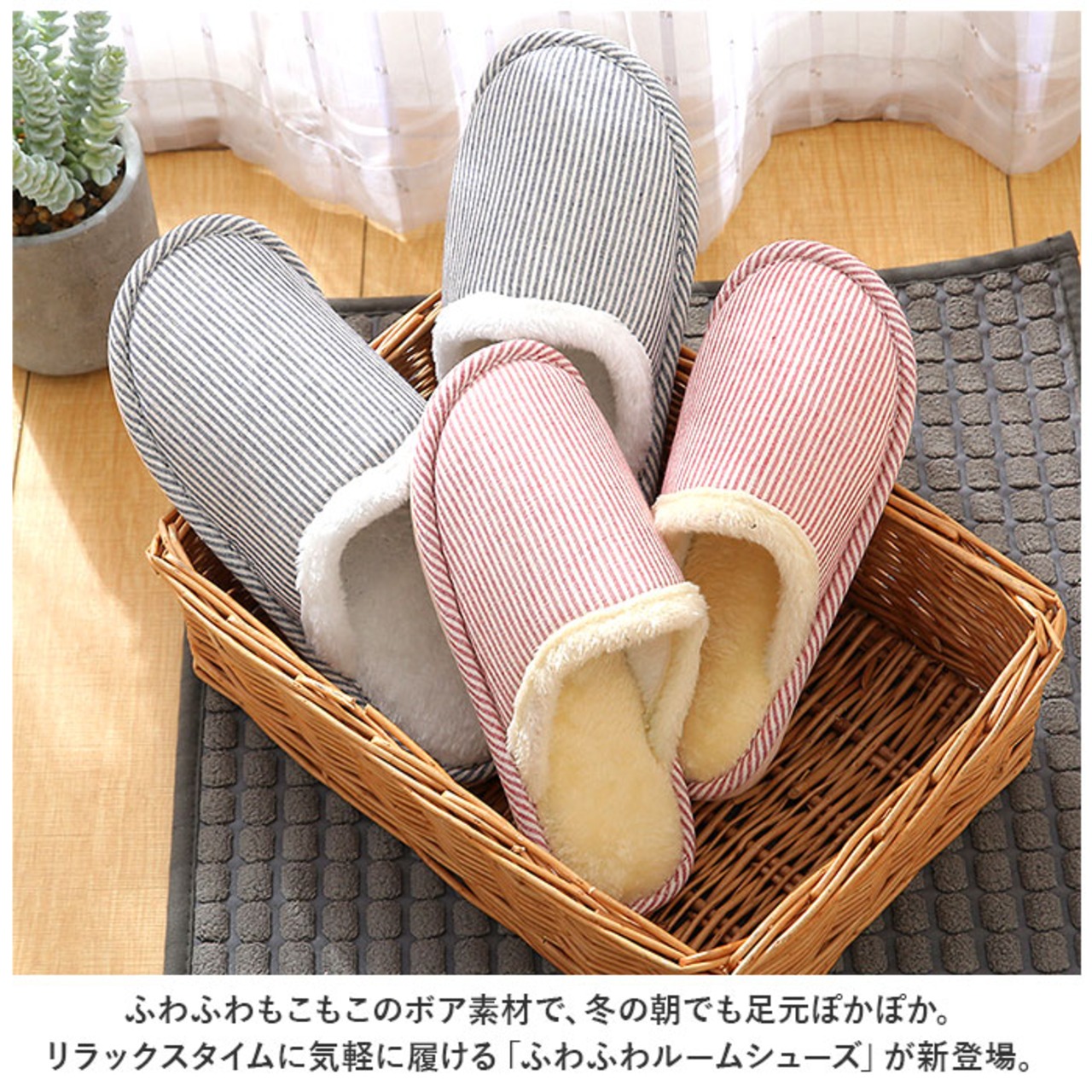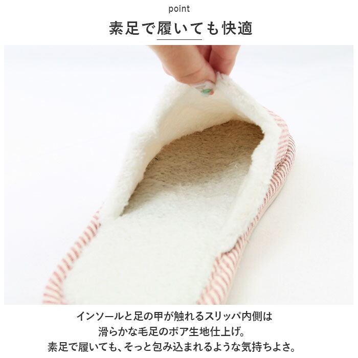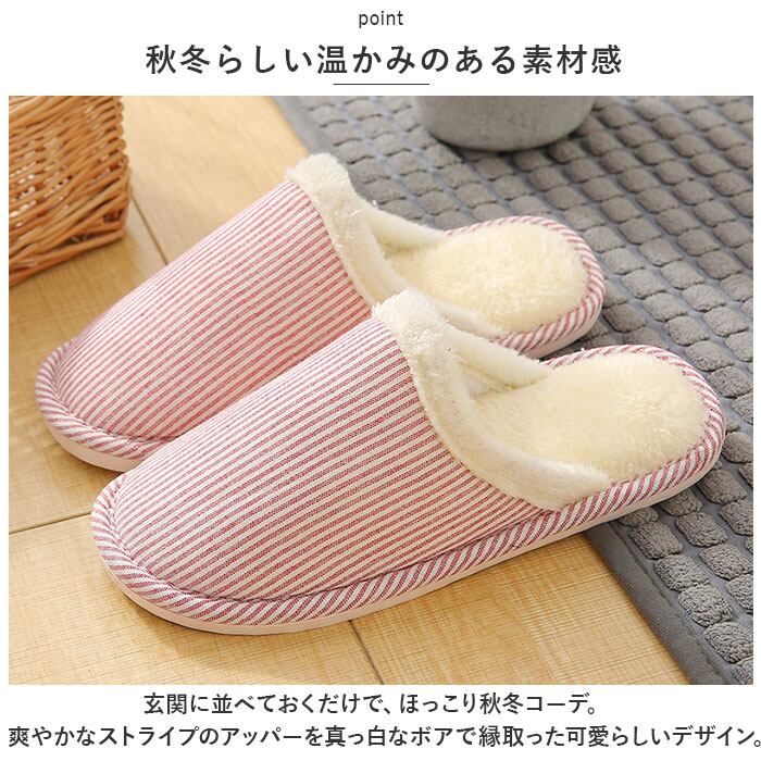 ・玄関に並べておくだけで、ほっこり秋冬コーデ。爽やかなストライプのアッパーを真っ白なボアで縁取った可愛らしいデザイン。
