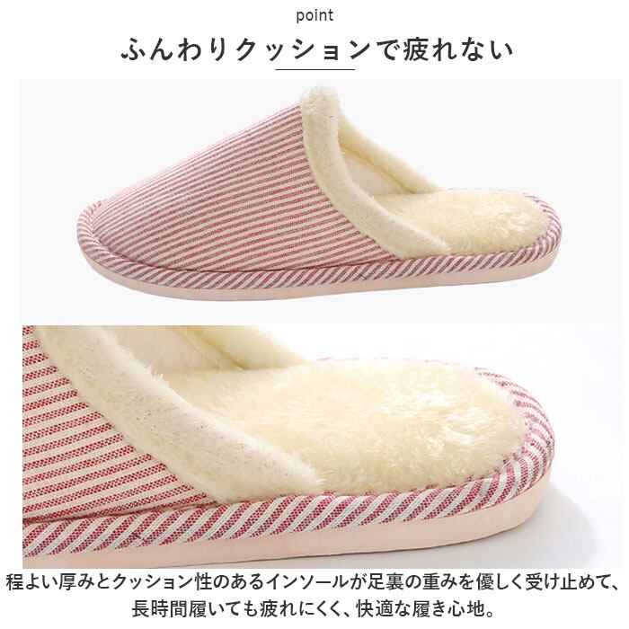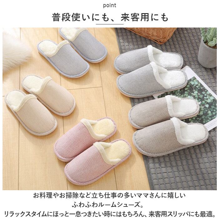 ・お料理やお掃除など立ち仕事の多いママさんに嬉しいふわふわルームシューズ。リラックスタイムにほっと一息つきたい時にはもちろん、来客用スリッパにも最適。