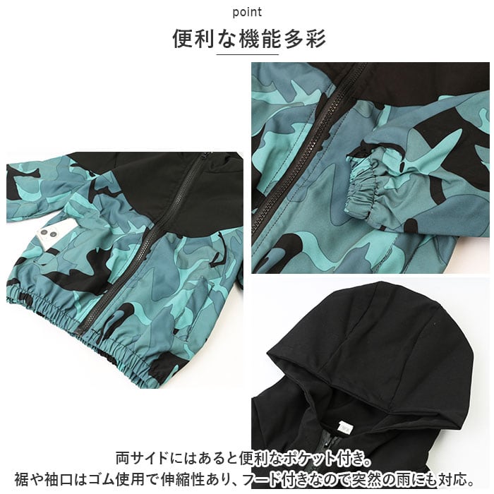 ・両サイドにはあると便利なポケット付き。裾や袖口はゴム使用で伸縮性あり、フード付きなので突然の雨にも対応。