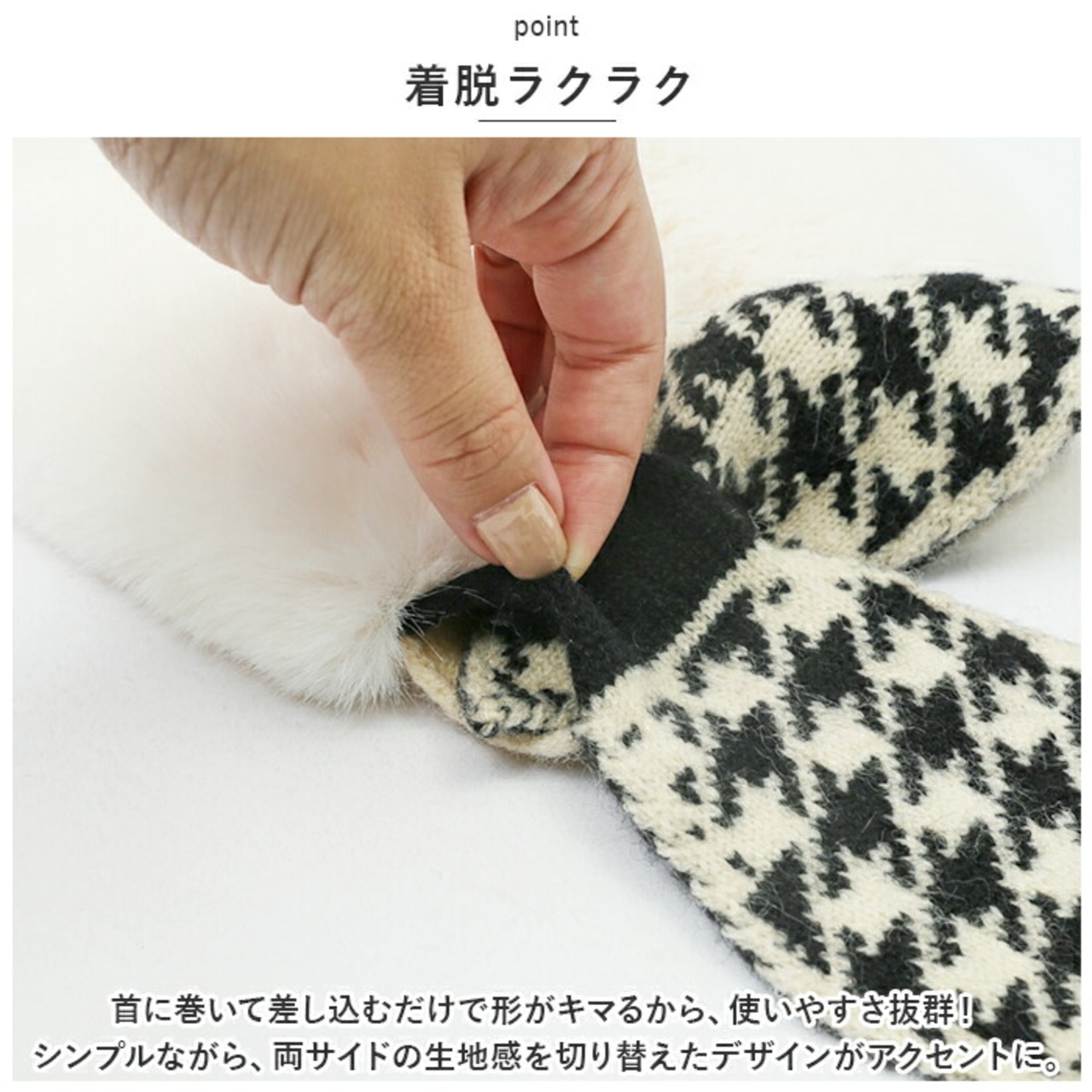 ・首に巻いて差し込むだけで形がキマるから、使いやすさ抜群!シンプルながら、両サイドの生地感を切り替えたデザインがアクセントに。