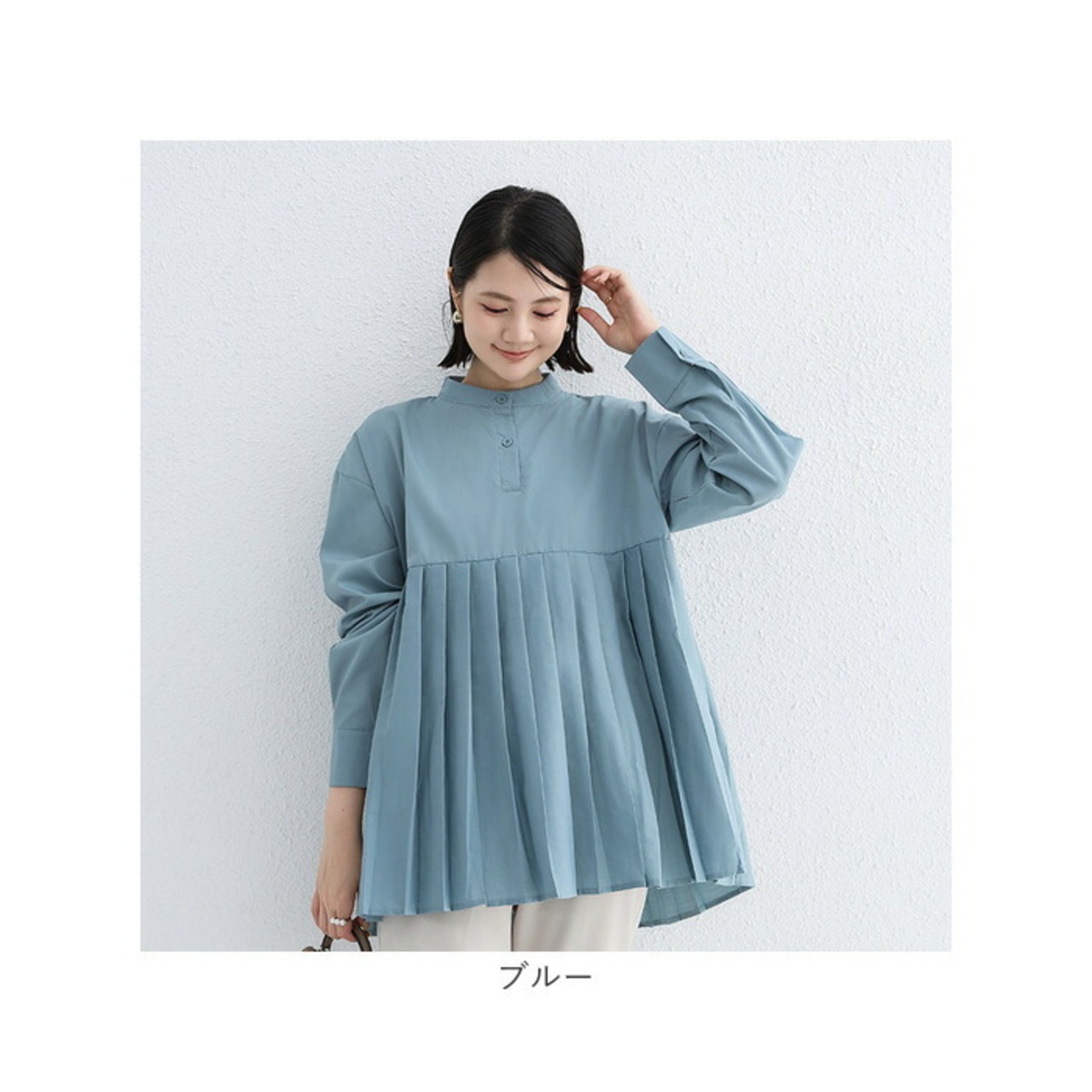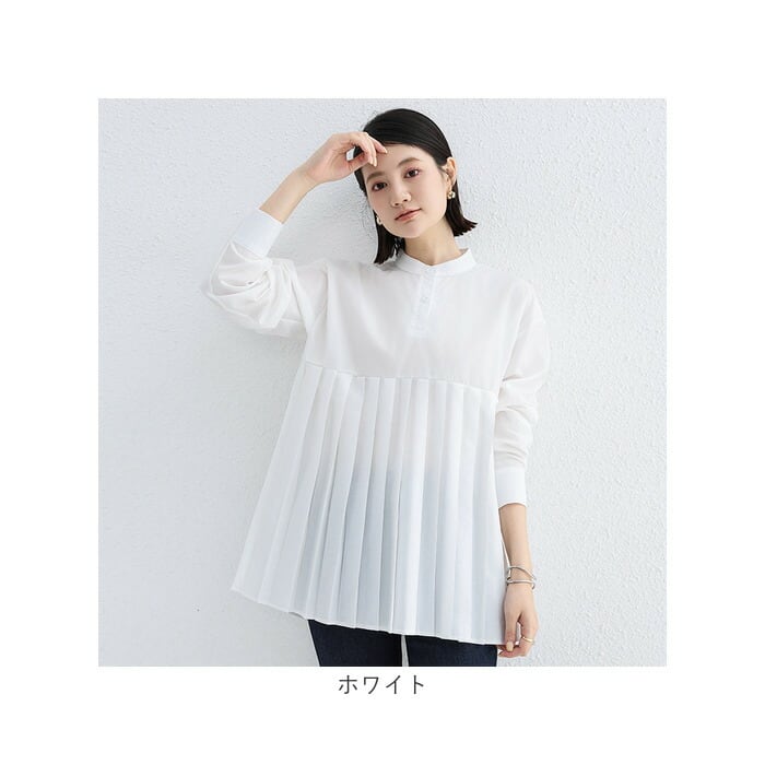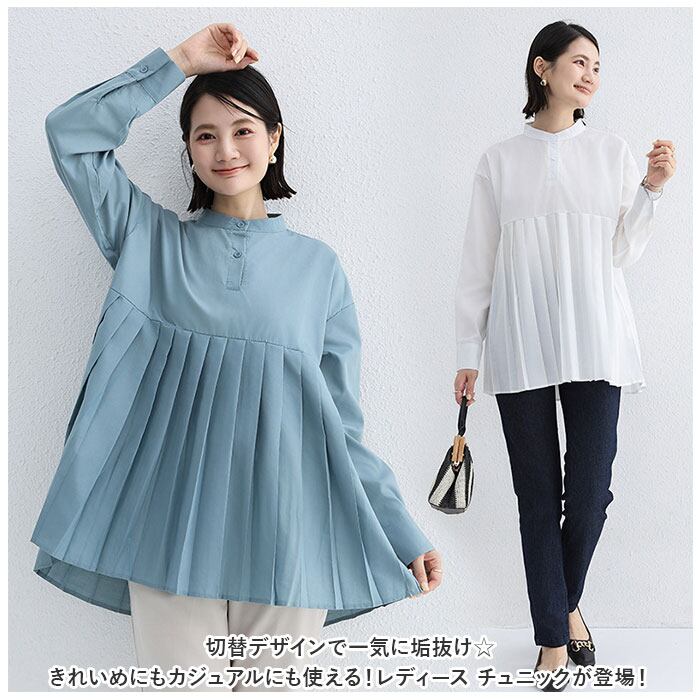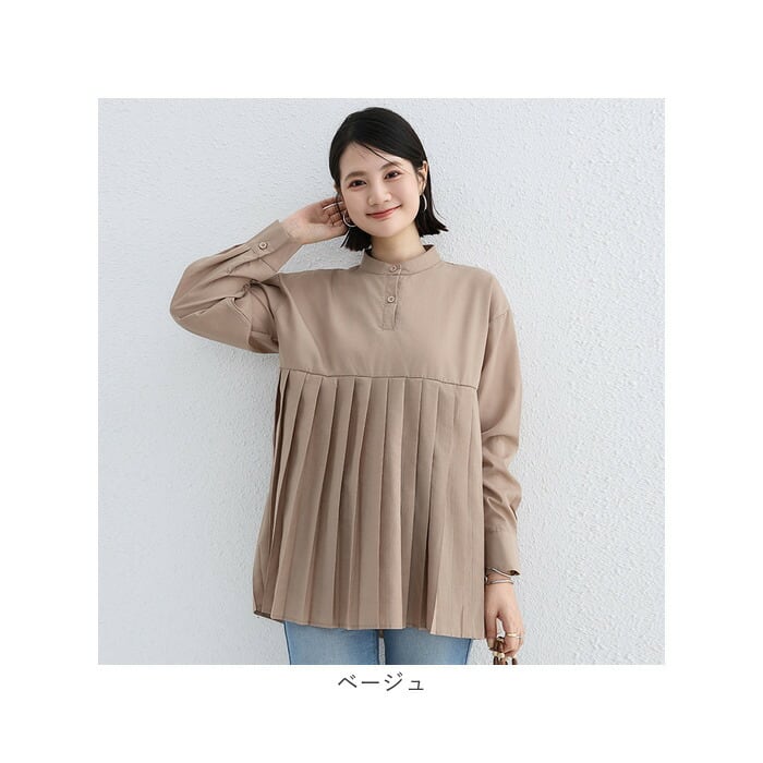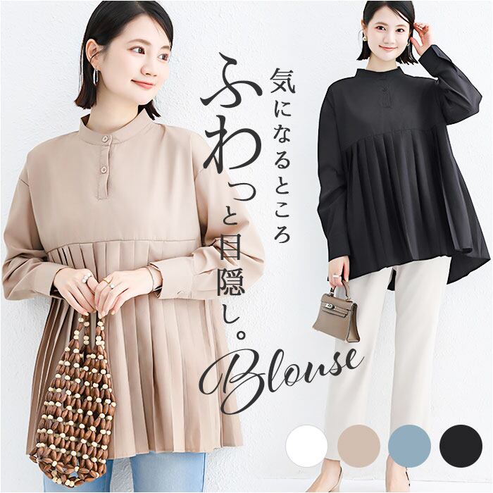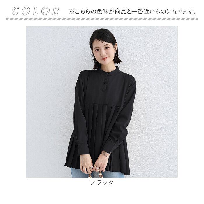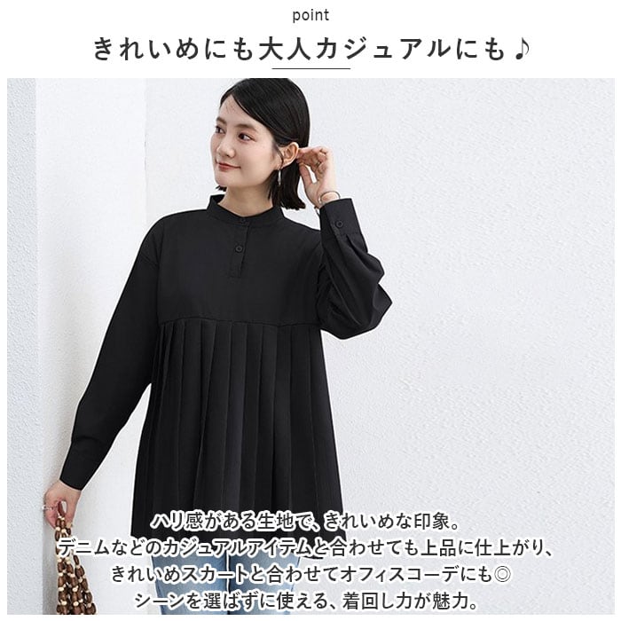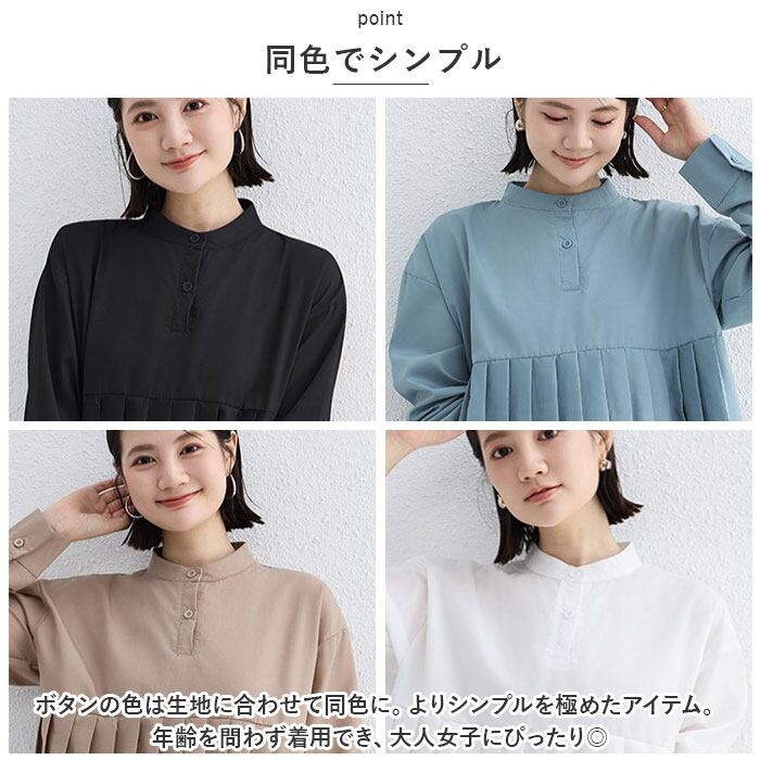 ブラウス シャツ 長袖 レディース 通販 チュニック トップス プリーツ 切り替え スタンドカラー ハイウエスト ゆったり シンプル 無地 通勤 通学 オフィス カジュアル きれいめ 春 秋 冬 おしゃれ オシャレ かわいい カワイイ