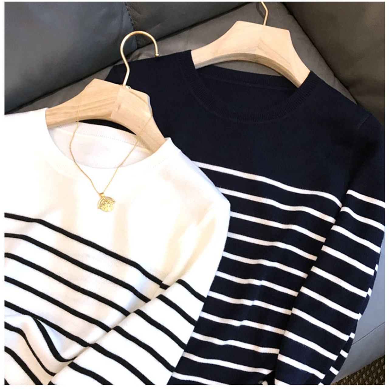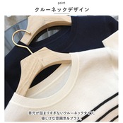 ・首元が詰まりすぎないクルーネックタイプ。優しげな雰囲気をプラス。