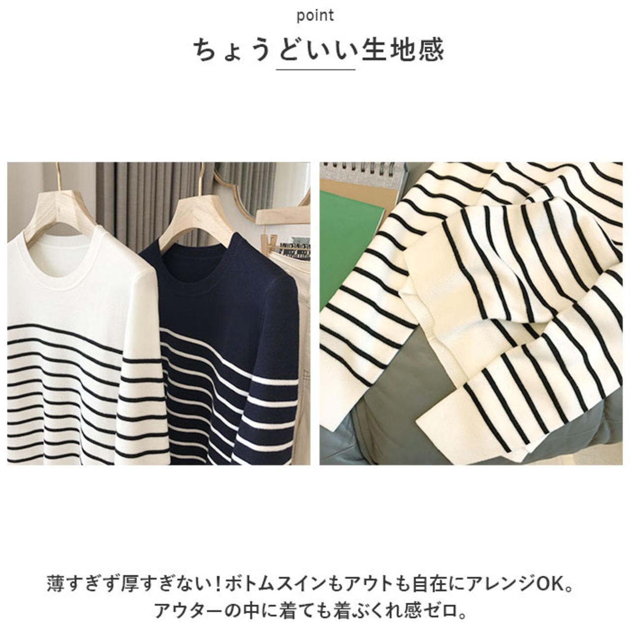 ・薄すぎず厚すぎない!ボトムスインもアウトも自在にアレンジOK。アウターの中に着ても着ぶくれ感ゼロ。