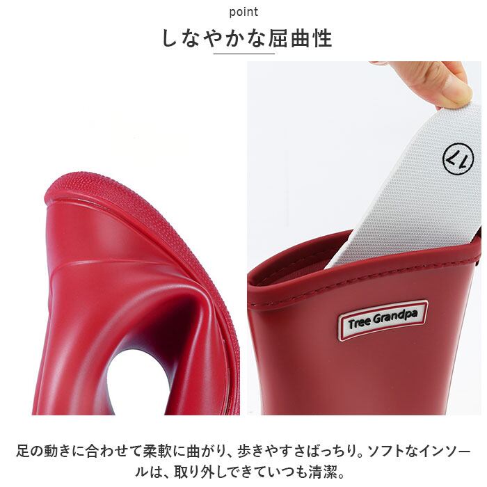 ・足の動きに合わせて柔軟に曲がり、歩きやすさばっちり。ソフトなインソールは、取り外しできていつも清潔。