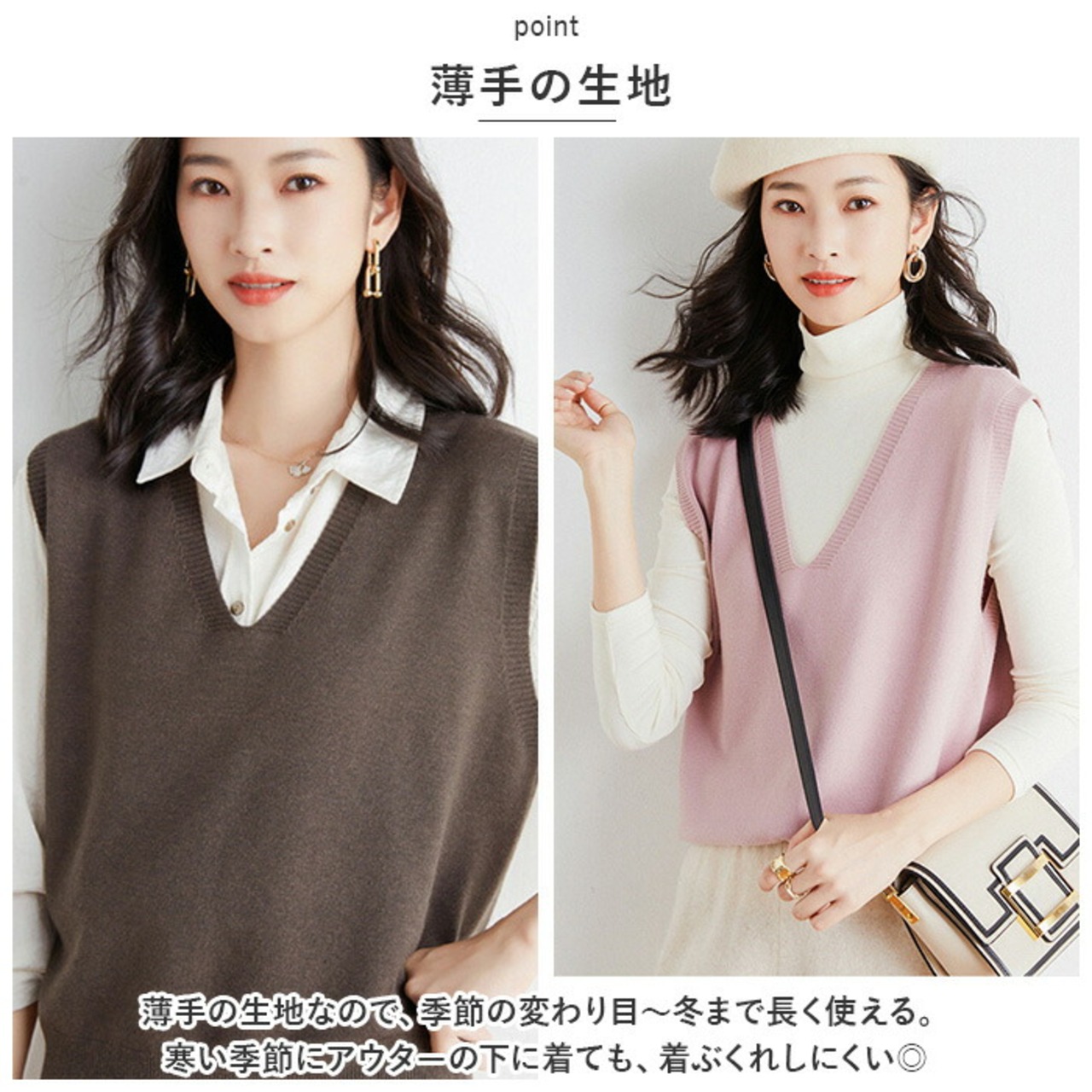 ・薄手の生地なので、季節の変わり目~冬まで長く使える。寒い季節にアウターの下に着ても、着ぶくれしにくい◎