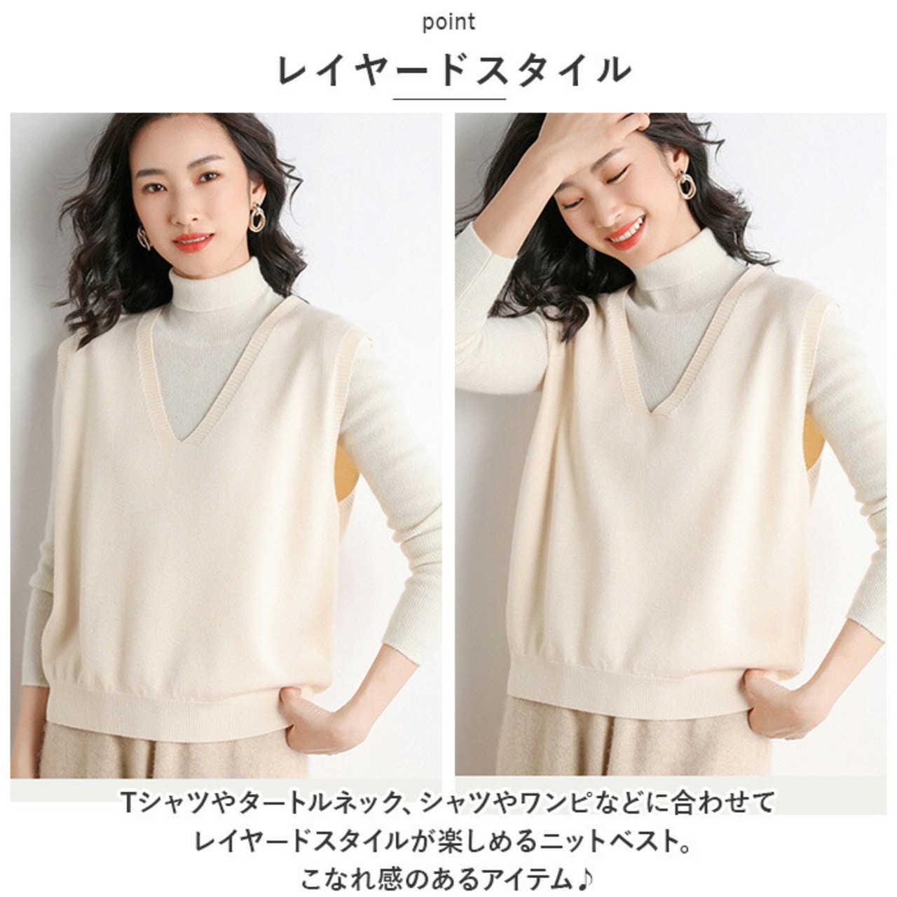 ・Tシャツやタートルネック、シャツやワンピなどに合わせてレイヤードスタイルが楽しめるニットベスト。こなれ感のあるアイテム♪
