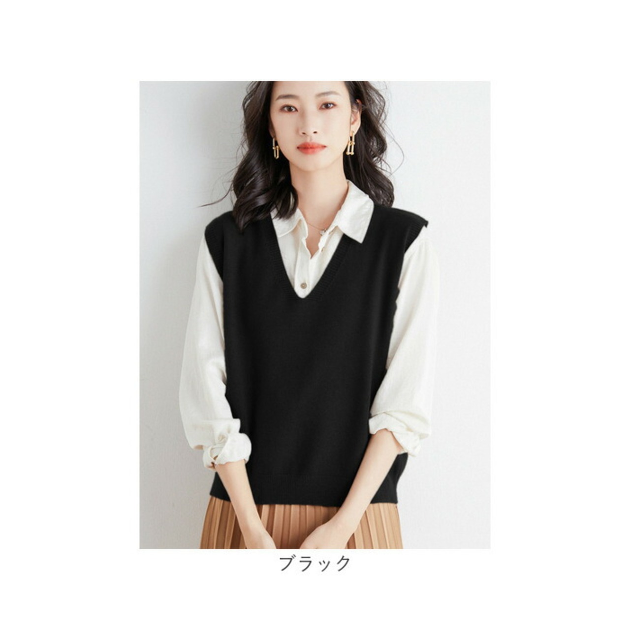 ・無地×Vネックのシンプルデザイン。レイヤードスタイル初心者の方でも取り入れやすいシンプルさが魅力。