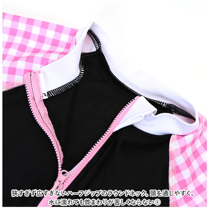 ・狭すぎず広すぎないハーフジップのラウンドネック。頭を通しやすく、水に濡れても首まわりが苦しくならない◎ファスナーガード付きなのも嬉しい♪