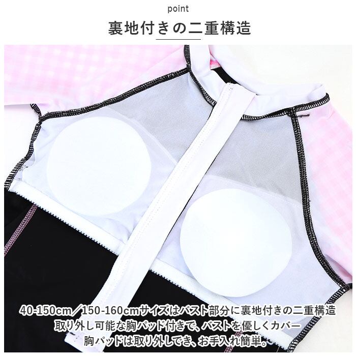 ・140-150cm/150-160cmサイズはバスト部分に裏地付きの二重構造。取り外し可能な胸パッド付きで、バストを優しくカバー。胸パッドは取り外しでき、お手入れ簡単。