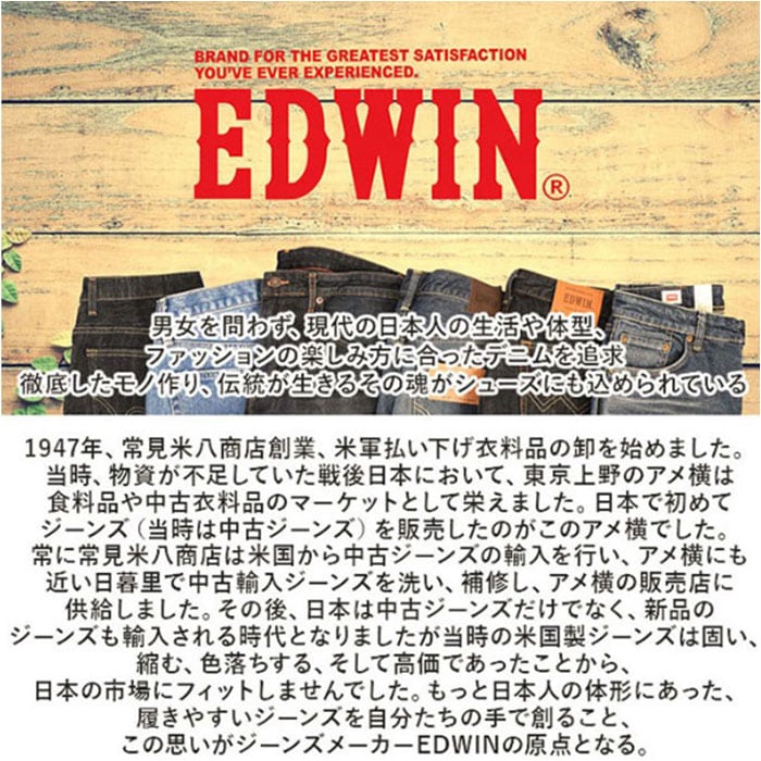 ・1961年に日本で初めて国内縫製のブルージーンズを誕生させた「EDWIN」。創業から現在に至るまで、永遠の定番「EDWIN 503」を始め、時代と共に進化し続けるNo.1デニムブランド。
