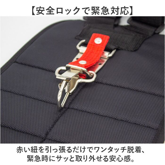 ・赤い紐を引っ張るだけでワンタッチ脱着、緊急時にサッと取り外せる安心感。
