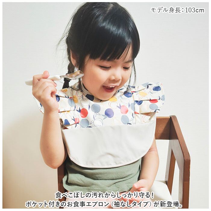 ・食べこぼしの汚れからしっかり守る!ポケット付きのお食事エプロン(袖なしタイプ)が新登場。