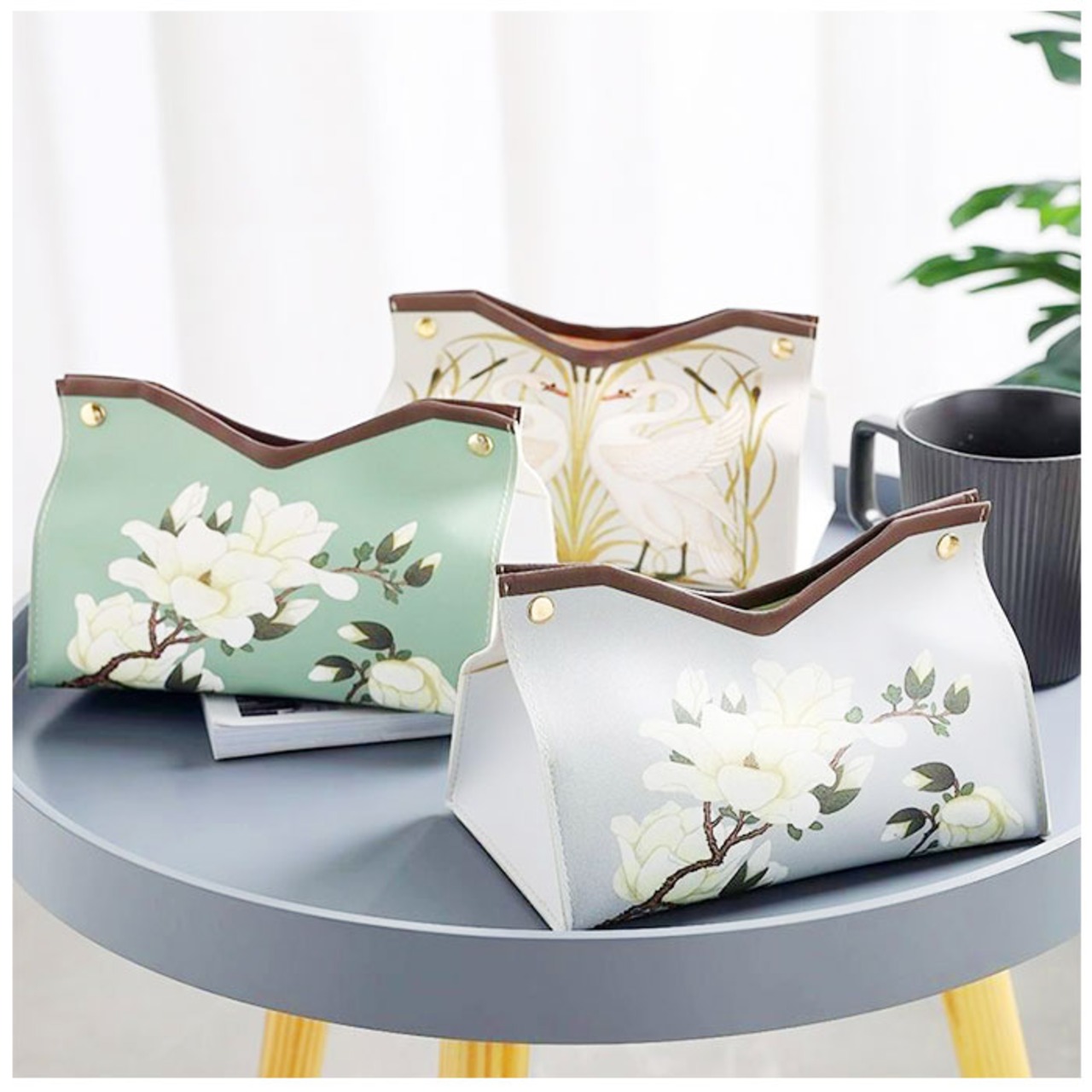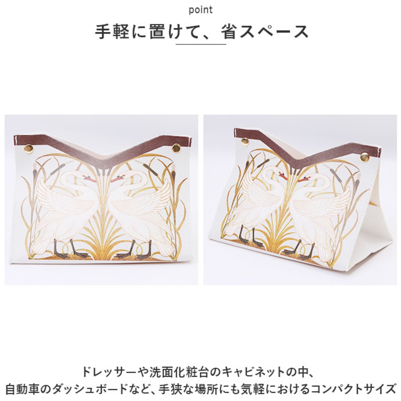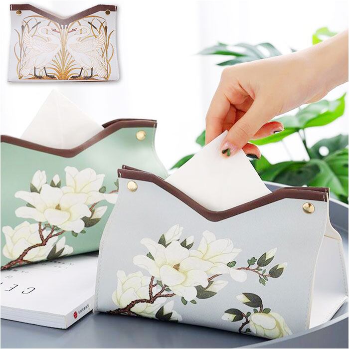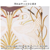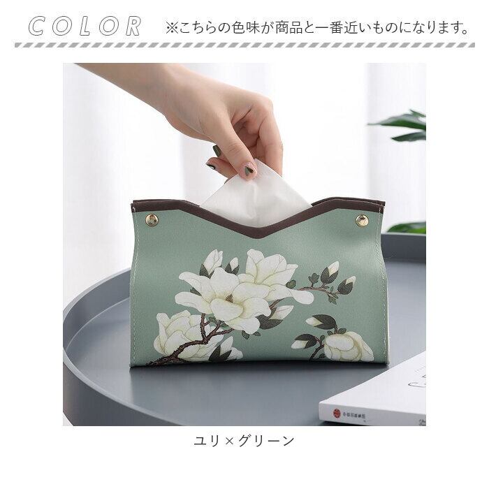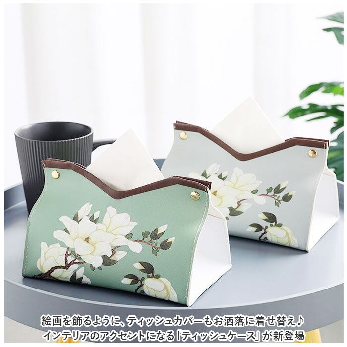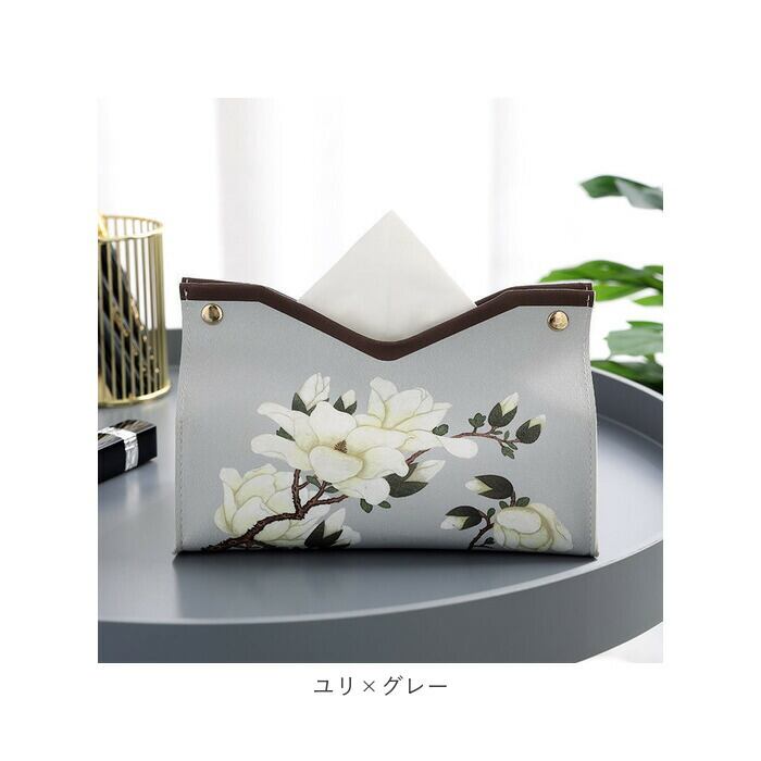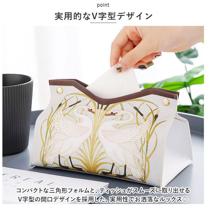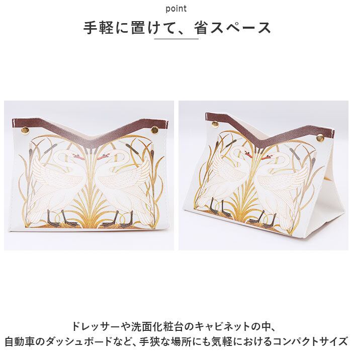・くすみカラーの背景に、翼を広げる白鳥や咲き誇る花を繊細なタッチで描きだしたエレガントなデザイン。カバーを掛けるだけで、生活感が出てしまいがちなティッシュがオシャレに変身!