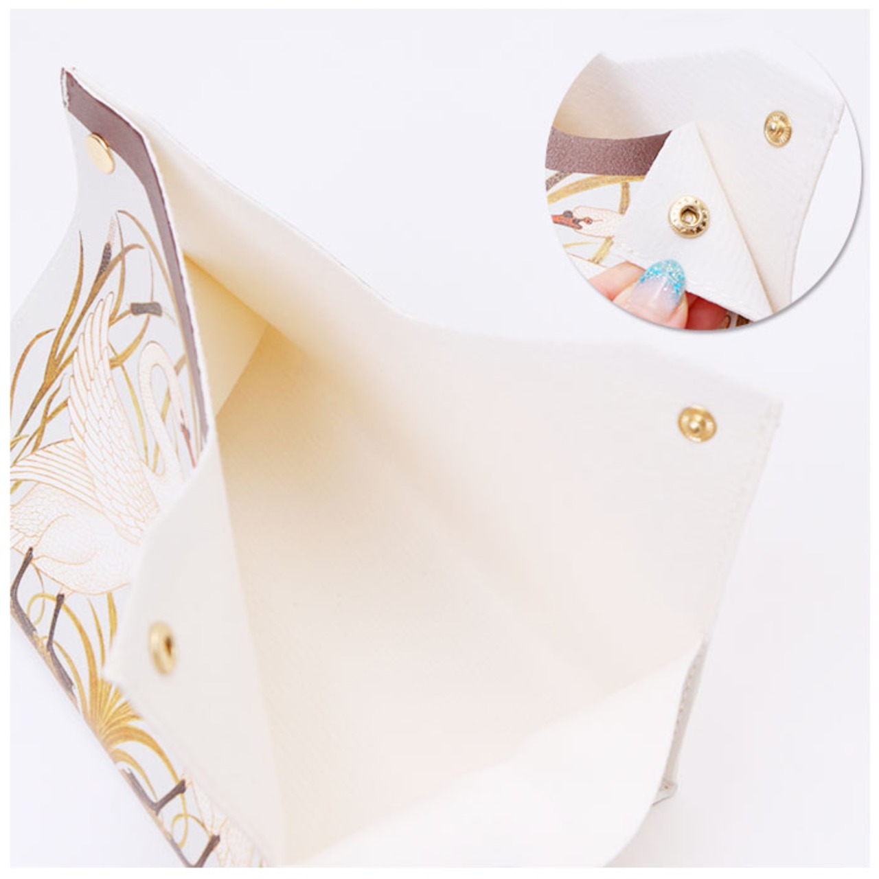 ・スナップボタン式の開口部を開いて、上からティッシュペーパーのリフィルをポンッと収納するだけで、詰め替え作業が楽ちん。(※ボックスタイプのティッシュはそのまま収納できません。箱から詰め替えてご使用になるか、ソフトパックタイプのティッシュのご利用をお勧めします。)