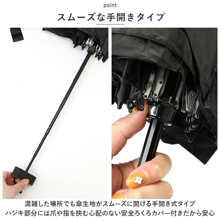 ・混雑した場所でも傘生地がスムーズに開ける手開き式タイプ。ハジキ部分には爪や指を挟む心配のない安全ろくろカバー付きだから安心。