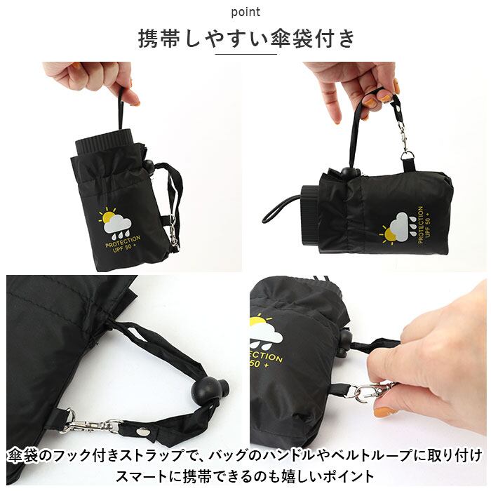 ・傘袋のフック付きストラップで、バッグのハンドルやベルトループに取り付けてスマートに携帯できるのも嬉しいポイント。
