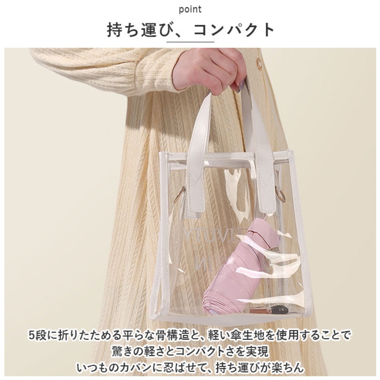 5段に折りたためる平らな骨構造と、軽い傘生地を使用することで驚きの軽さとコンパクトさを実現。いつものカバンに忍ばせて、持ち運びが楽ちん。
