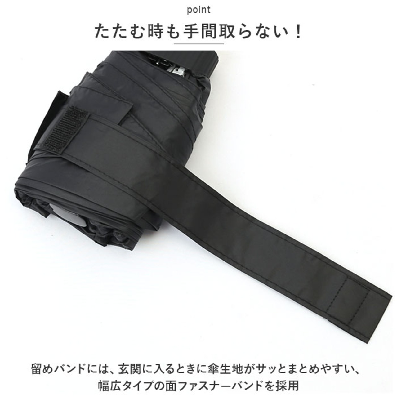 ・留めバンドには、玄関に入るときに傘生地がサッとまとめやすい、幅広タイプの面ファスナーバンドを採用。