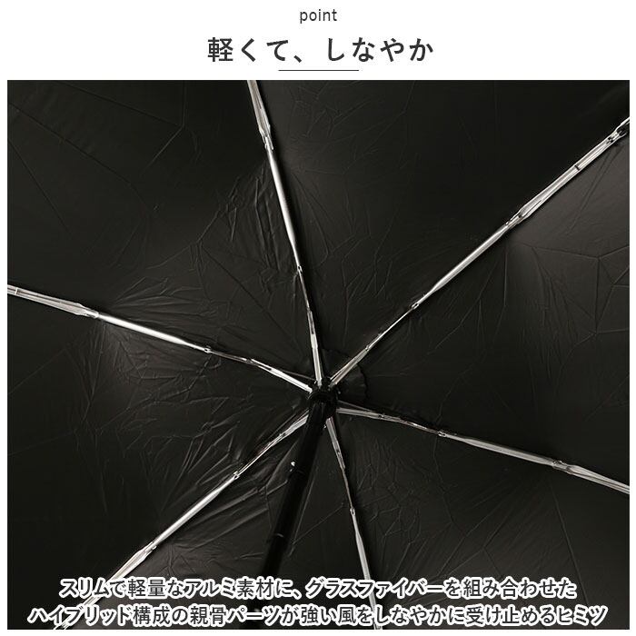 ・スリムで軽量なアルミ素材に、グラスファイバーを組み合わせたハイブリッド構成の親骨パーツが強い風をしなやかに受け止めるヒミツ。