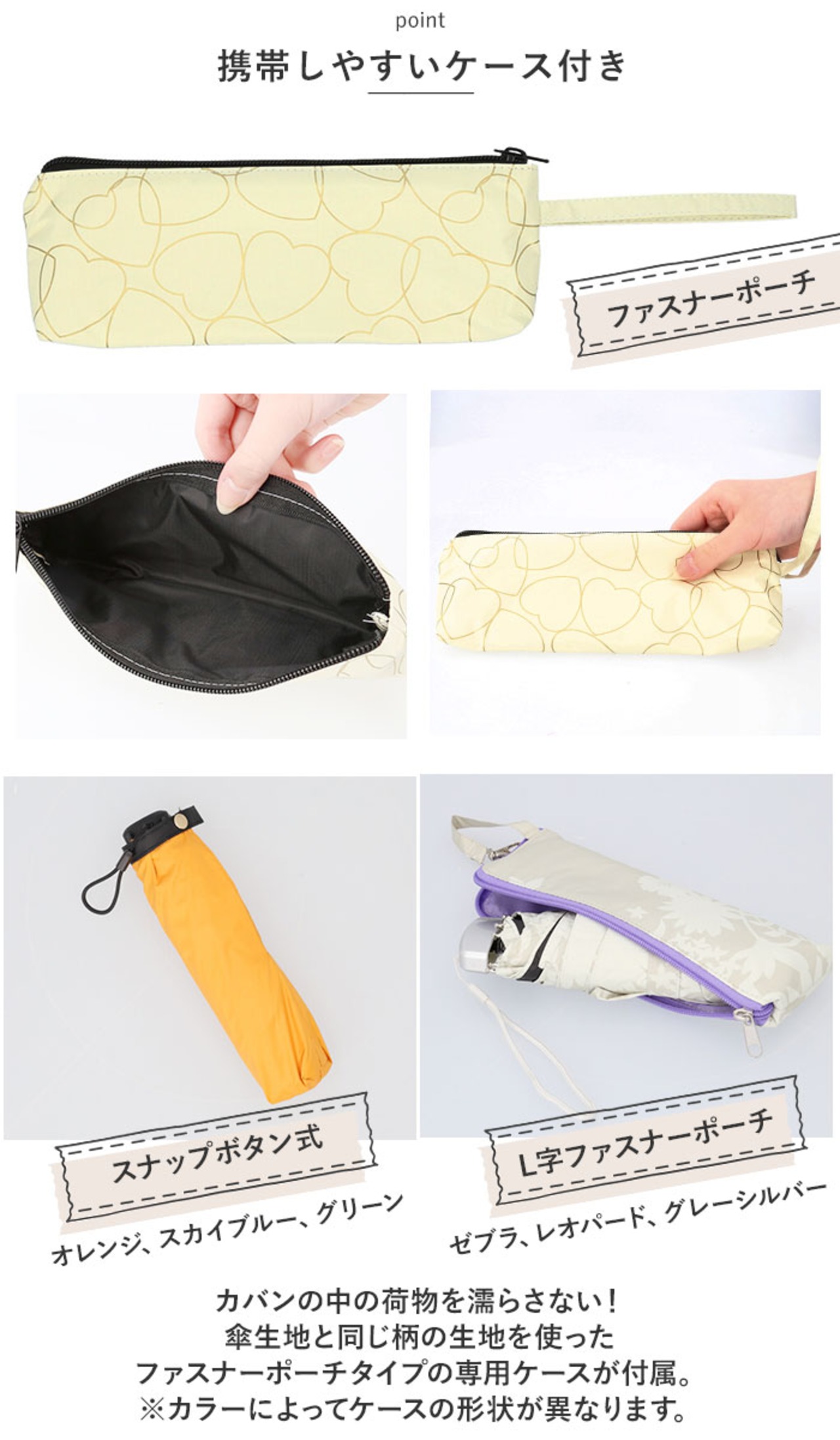 ・カバンの中の荷物を濡らさない!傘生地と同じ柄の生地を使ったファスナーポーチタイプの専用ケースが付属。