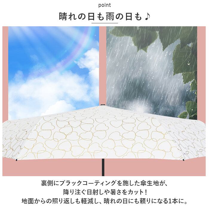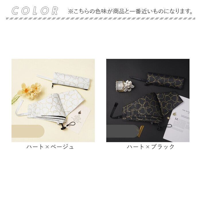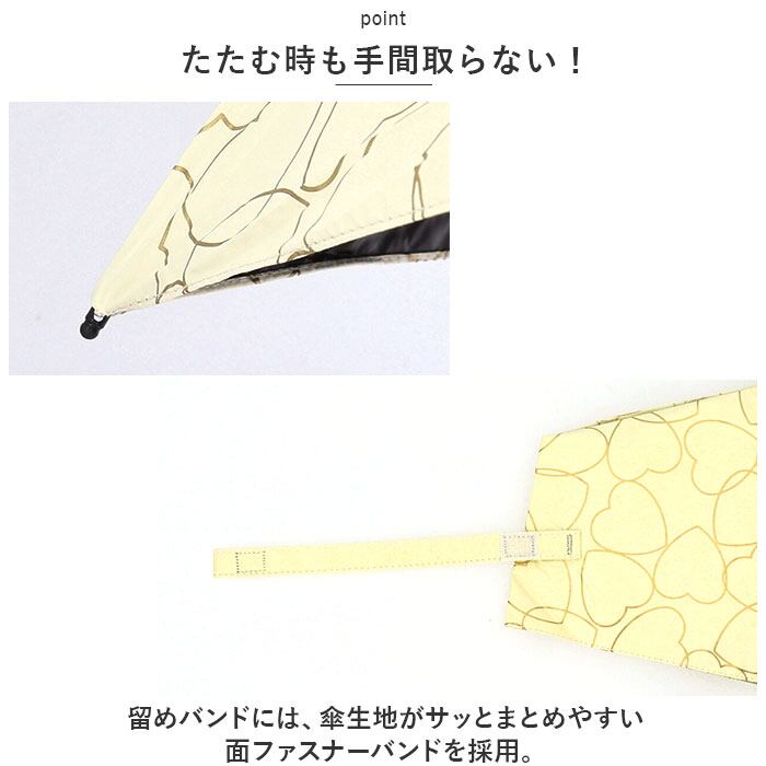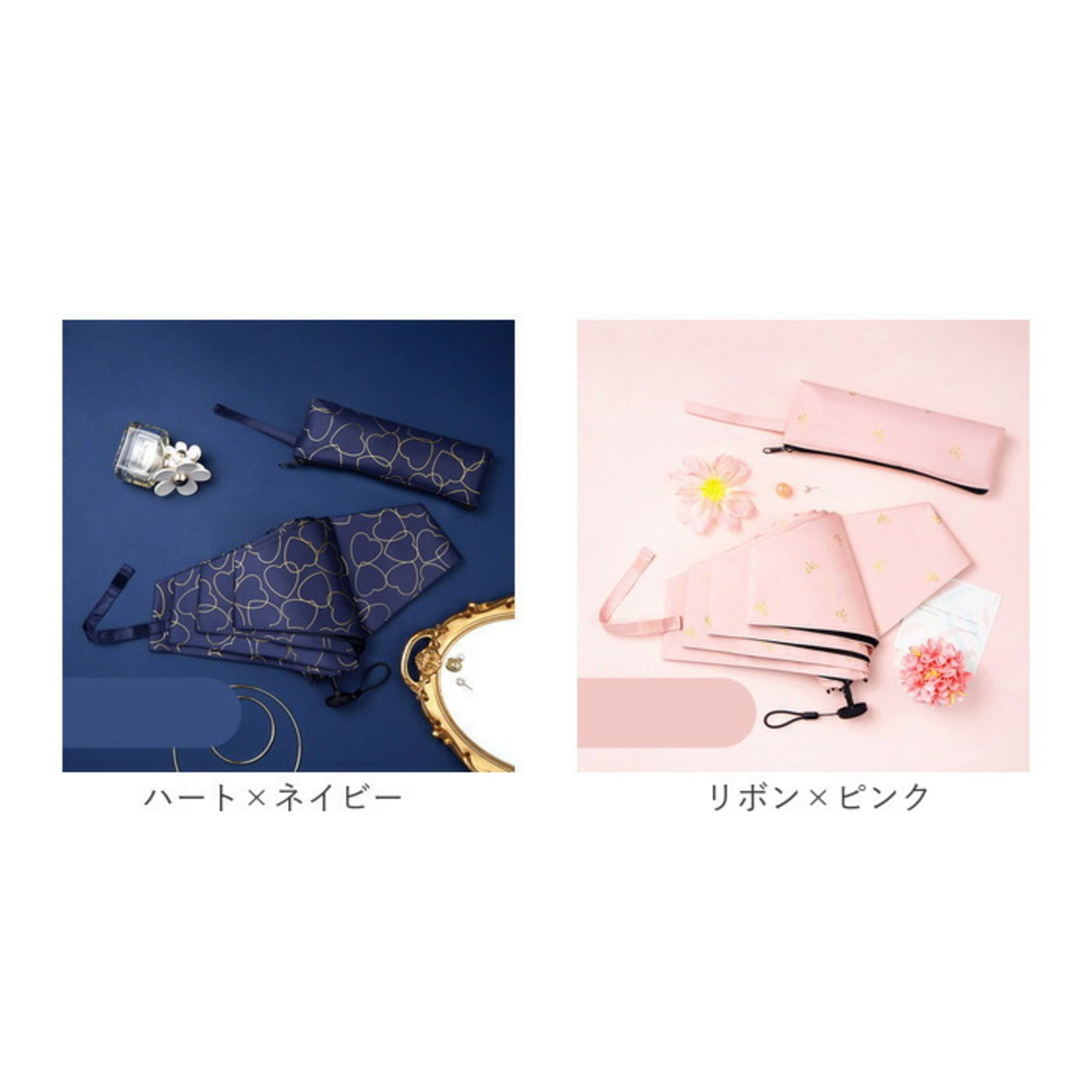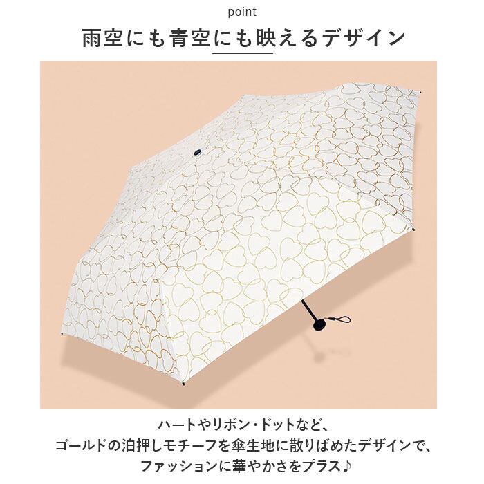 ・ハートやリボン・ドットなど、ゴールドの泊押しモチーフを傘生地に散りばめたデザインで、ファッションに華やかさをプラス♪