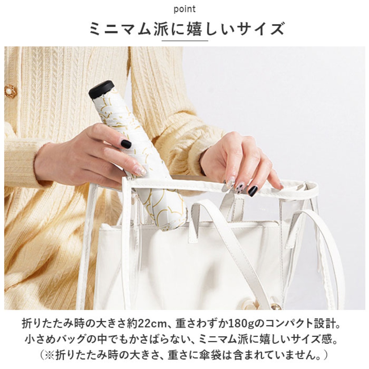 ・折りたたみ時の大きさ約20cm、重さわずか160gのコンパクト設計。小さめバッグの中でもかさばらない、ミニマム派に嬉しいサイズ感。(※折りたたみ時の大きさ、重さに傘袋は含まれていません。)