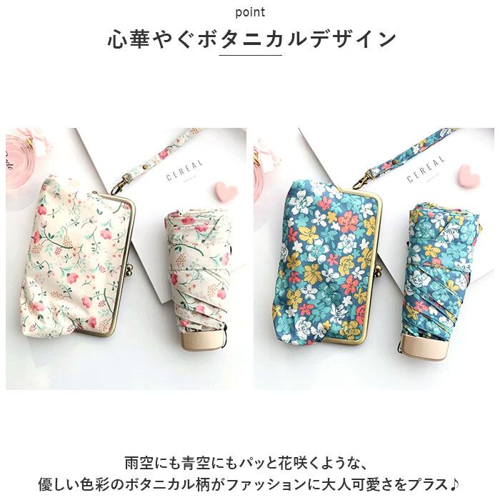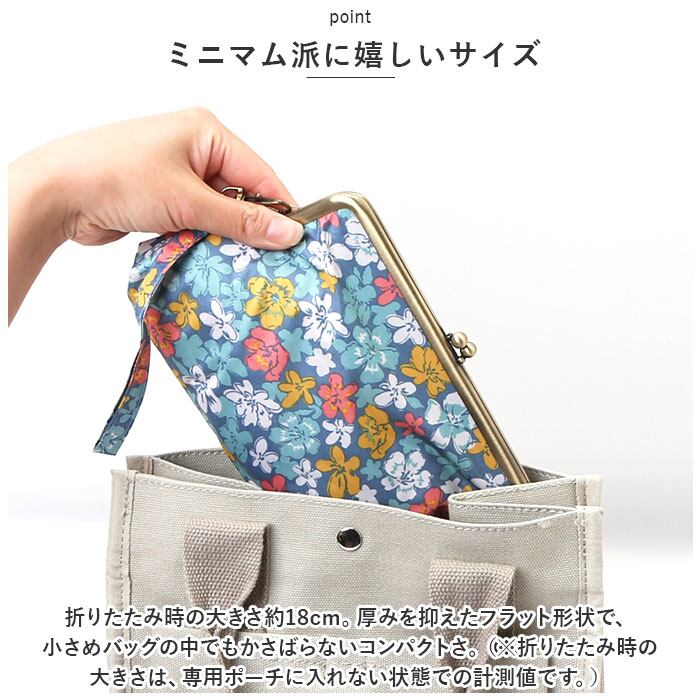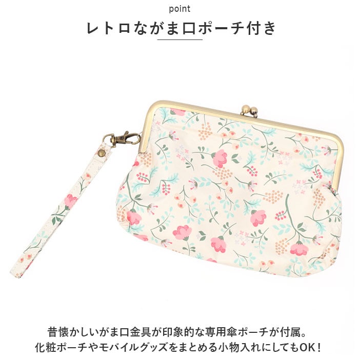 ・昔懐かしいがま口金具が印象的な専用傘ポーチが付属。化粧ポーチやモバイルグッズをまとめる小物入れにしてもOK!
