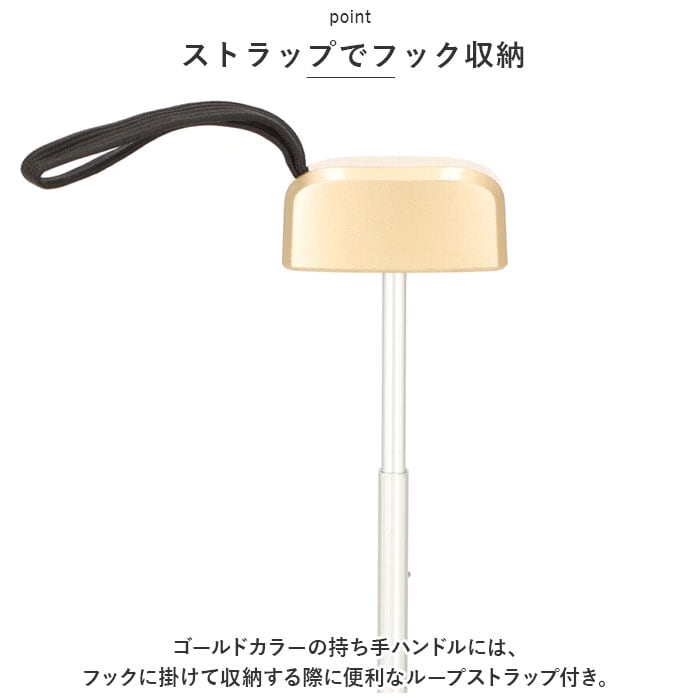 ・ゴールドカラーの持ち手ハンドルには、フックに掛けて収納する際に便利なループストラップ付き。