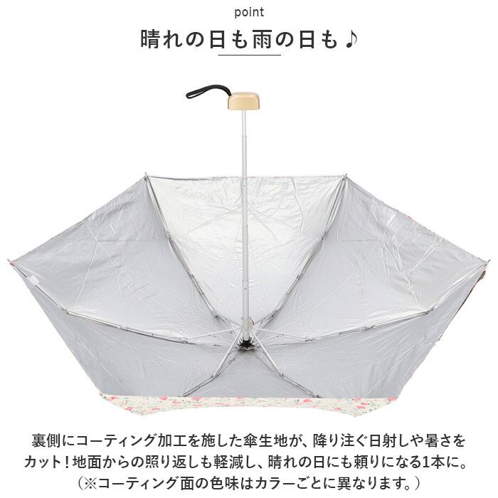 ・裏側にコーティング加工を施した傘生地が、降り注ぐ日射しや暑さをカット!地面からの照り返しも軽減し、晴れの日にも頼りになる1本に。(※コーティング面の色味はカラーごとに異なります。)