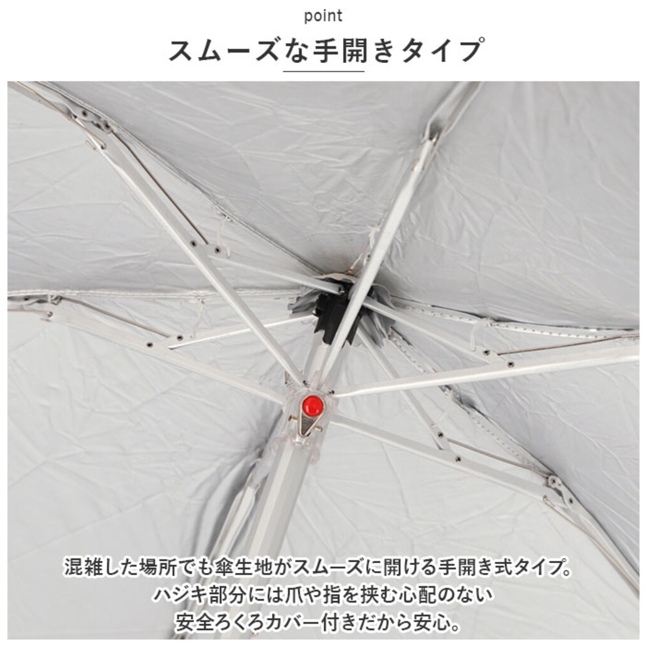 ・混雑した場所でも傘生地がスムーズに開ける手開き式タイプ。ハジキ部分には爪や指を挟む心配のない安全ろくろカバー付きだから安心。
