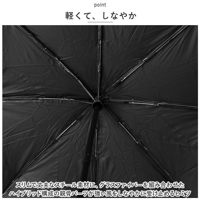 ・スリムで丈夫なスチール素材に、グラスファイバーを組み合わせたハイブリッド構成の親骨パーツが強い風をしなやかに受け止めるヒミツ。
