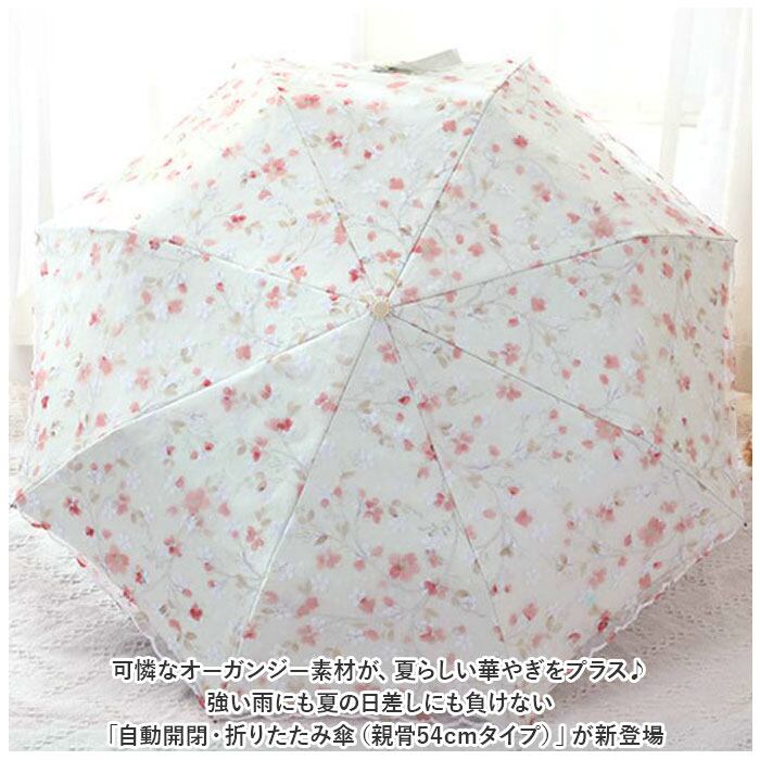 ・可憐なオーガンジー素材が、夏らしい華やぎをプラス♪強い雨にも夏の日差しにも負けない「自動開閉・折りたたみ傘(親骨54cmタイプ)」が新登場。