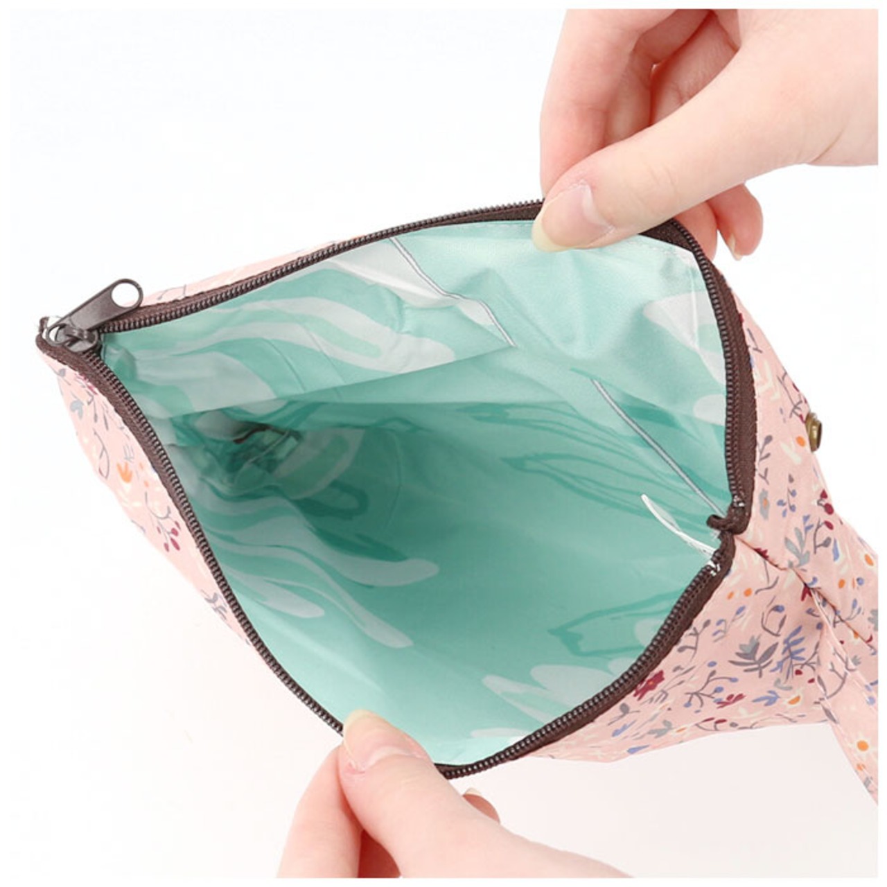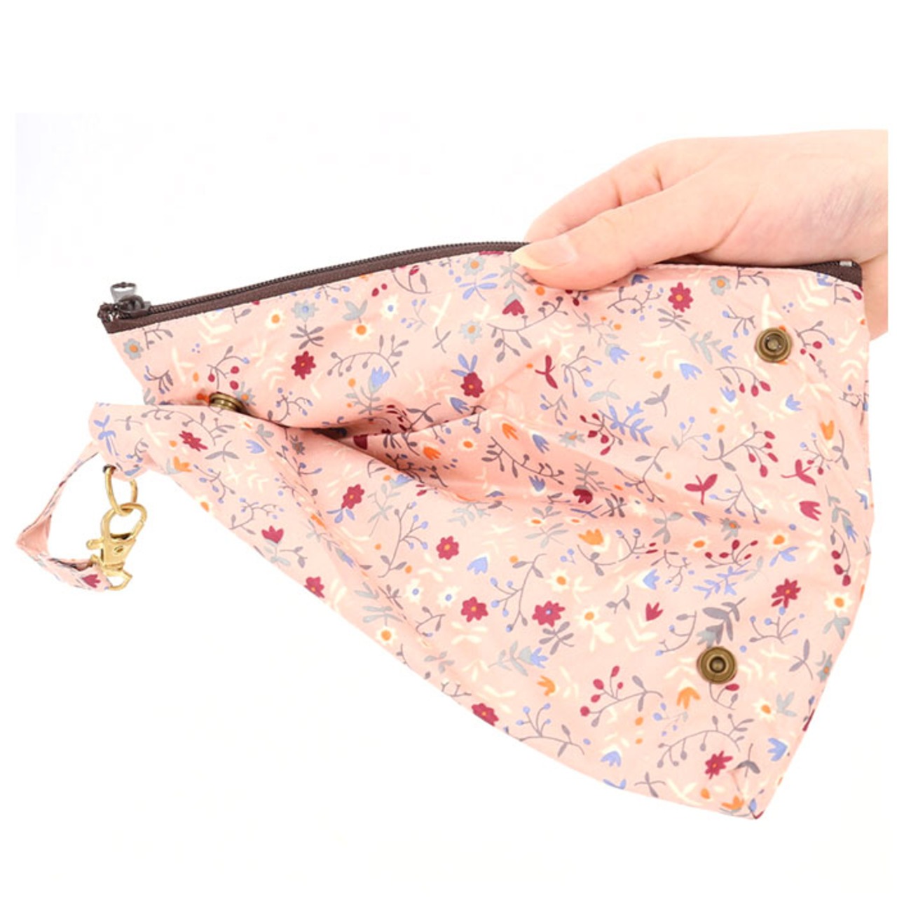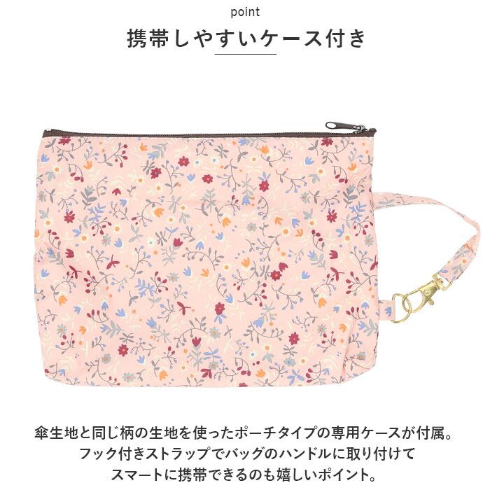 ・傘生地と同じ柄の生地を使ったポーチタイプの専用ケースが付属。フック付きストラップでバッグのハンドルに取り付けてスマートに携帯できるのも嬉しいポイント。