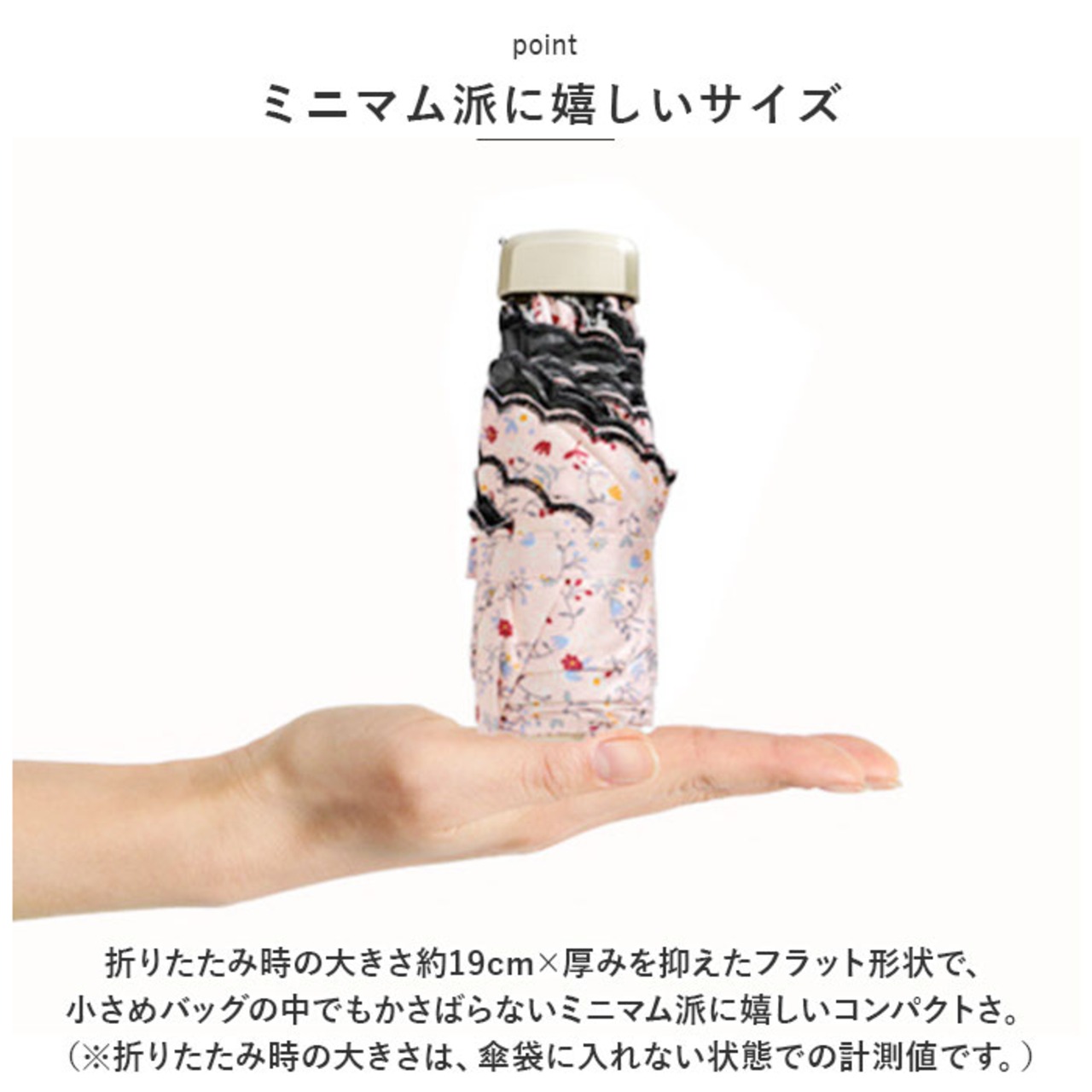 ・折りたたみ時の大きさ約19cm×厚みを抑えたフラット形状で、小さめバッグの中でもかさばらないミニマム派に嬉しいコンパクトさ。(※折りたたみ時の大きさは、傘袋に入れない状態での計測値です。)