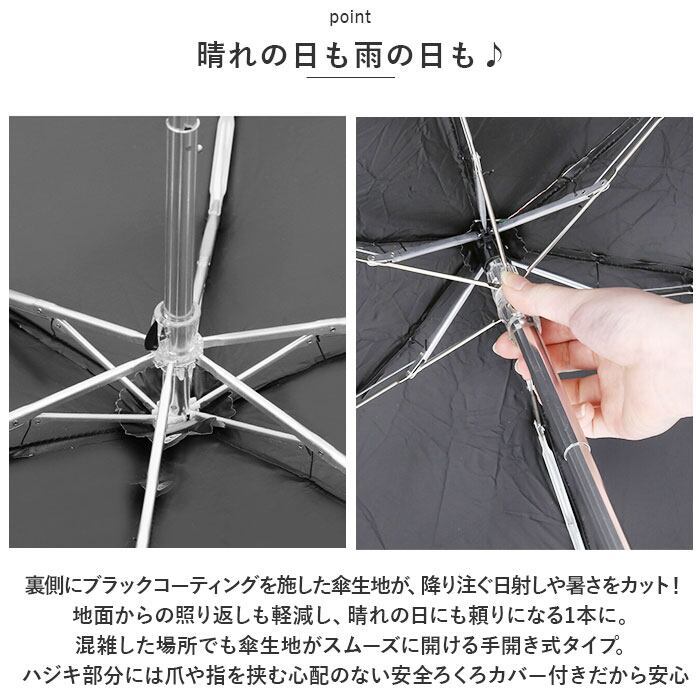 ・裏側にブラックコーティングを施した傘生地が、降り注ぐ日射しや暑さをカット!地面からの照り返しも軽減し、晴れの日にも頼りになる1本に。