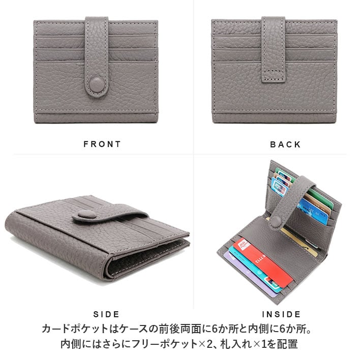 ・カードポケットはケースの前後両面に6か所と内側に6か所。内側にはさらにフリーポケット×2、札入れ×1を配置しコンパクトな見た目ながら収納力抜群。