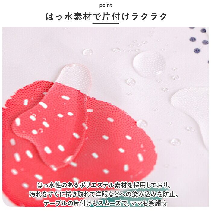 ・はっ水性のあるポリエステル素材を採用しており、汚れをすぐに拭き取れて洋服などへの染み込みを防止。テーブルの片付けもスムーズで、ママも笑顔☆
