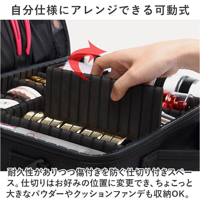 ・耐久性がありつつ傷付きを防ぐ仕様の仕切り付きスペース。仕切りはお好みの位置に変更でき、ちょこっと大きなパウダーやクッションファンデも収納OK。