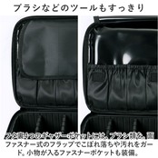 ・フタ裏4つのギャザーポケットには、ブラシ類を。面ファスナー式のフラップでこぼれ落ちや汚れをガード。小物が入るファスナーポケットも装備。