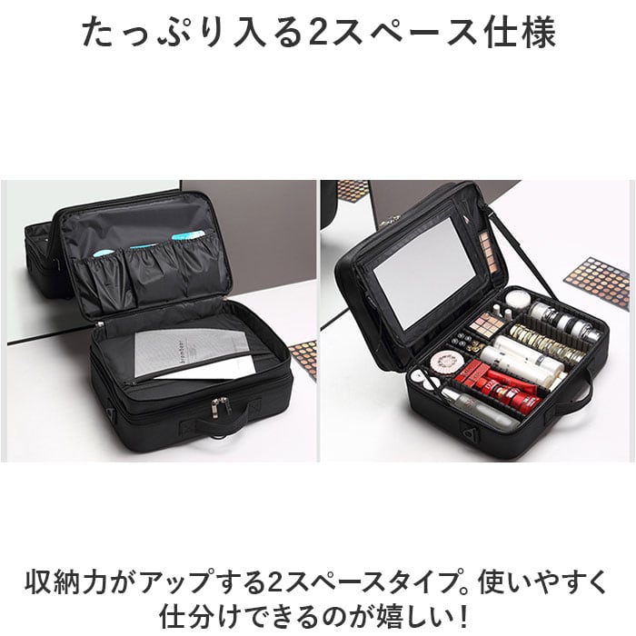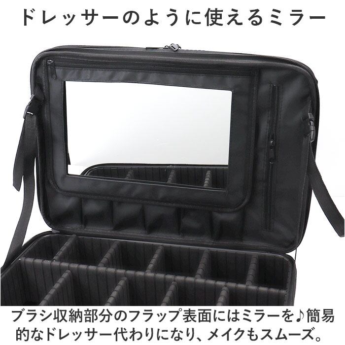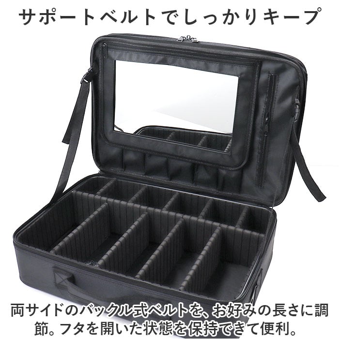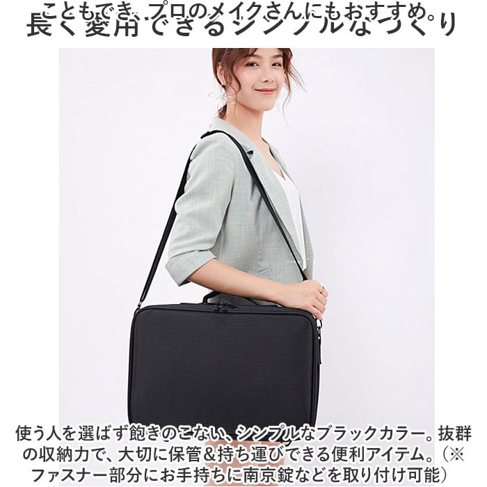 ・長さ調節できるショルダーベルトを取り付けて、肩掛け。背面のベルトをキャリーケースのバーに通すこともでき、プロのメイクさんにもおすすめ。