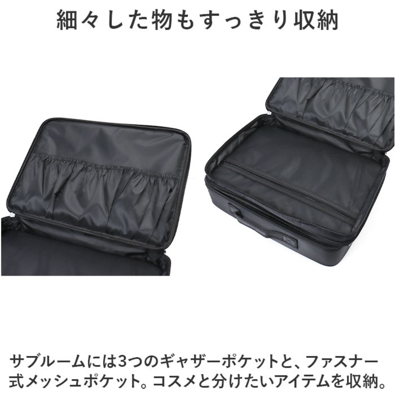 ・サブルームには3つのギャザーポケットと、ファスナー式メッシュポケット。コスメと分けたいアイテムを収納。