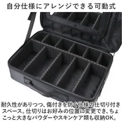 ・耐久性がありつつ、傷付きを防ぐ仕様の仕切り付きスペース。仕切りはお好みの位置に変更でき、ちょこっと大きなパウダーやスキンケア類も収納OK。