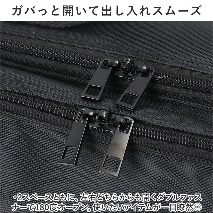 ・2スペースともに、左右どちらからも開くダブルファスナーで180度オープン。使いたいアイテムが一目瞭然◎