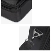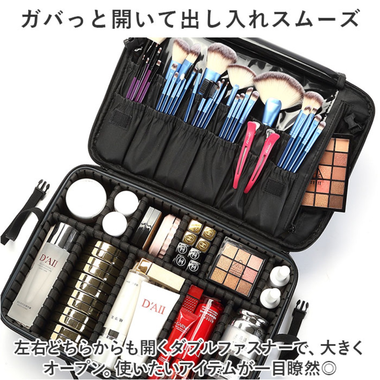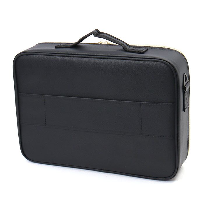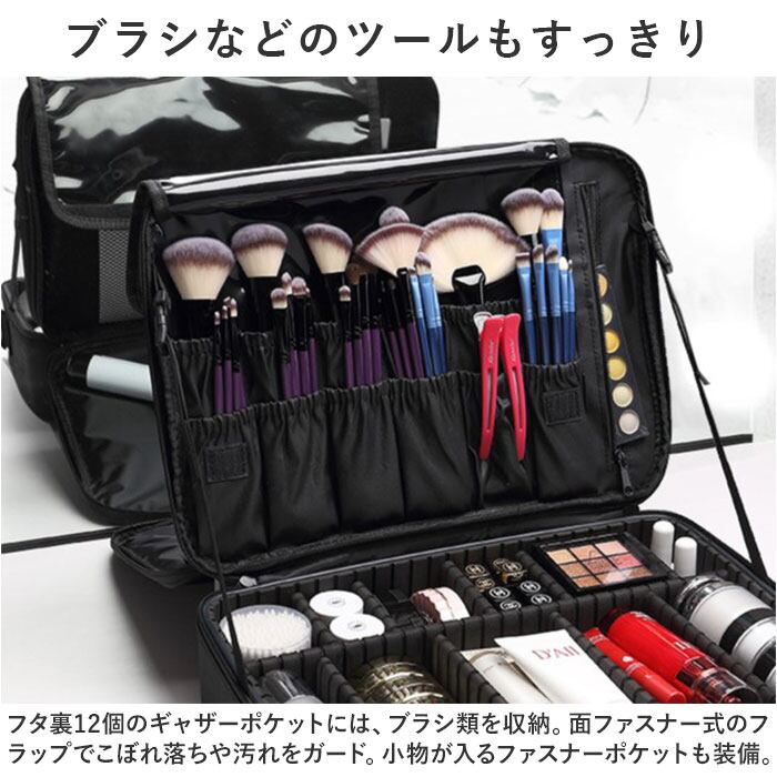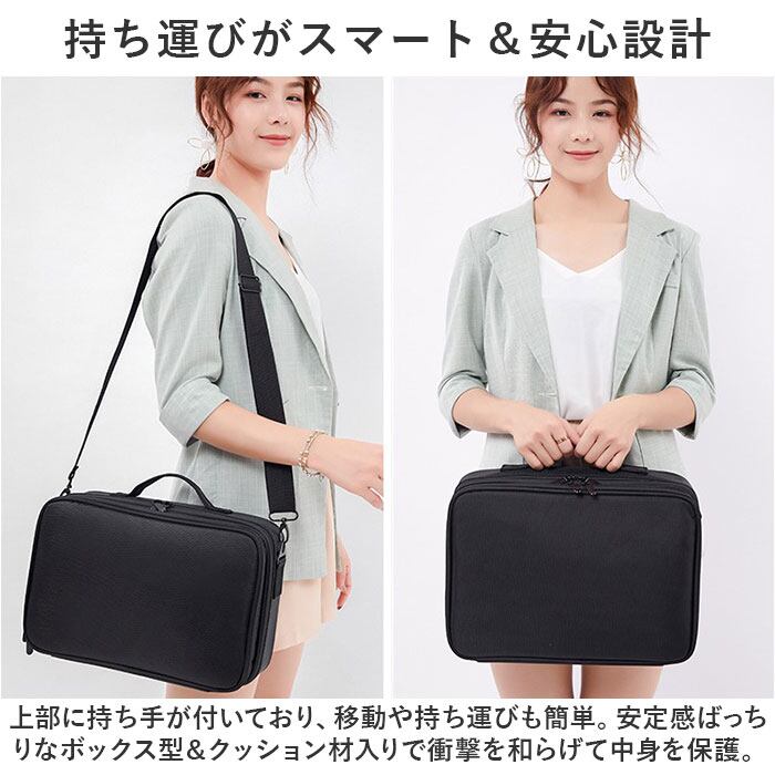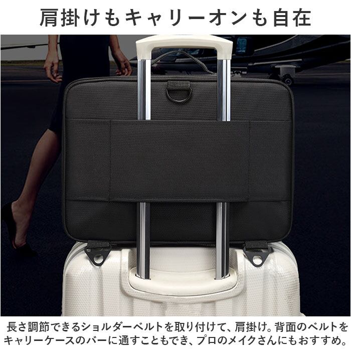 ・長さ調節できるショルダーベルトを取り付けて、肩掛け。背面のベルトをキャリーケースのバーに通すこともでき、プロのメイクさんにもおすすめ。